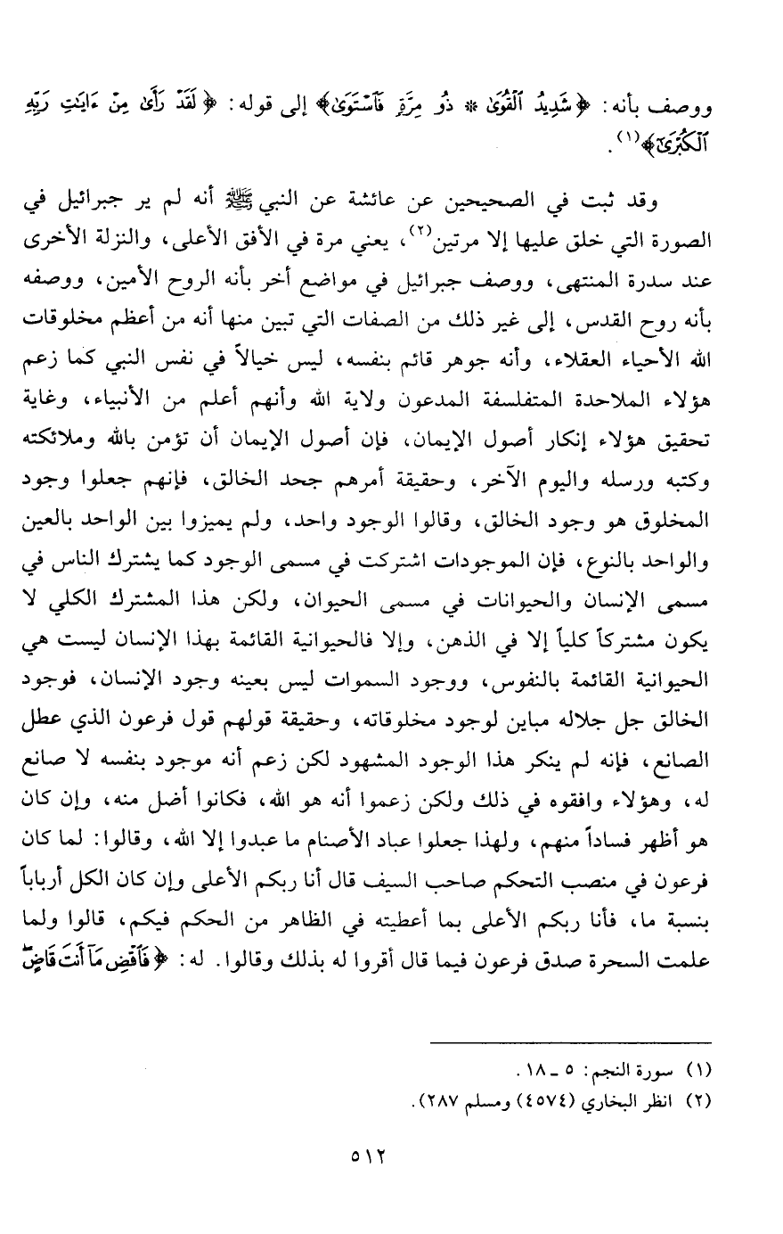 وقد ثبت في الصحيحين عن عائشة عن النبي صلى الله عليه وسلم أنه لم ير جبرائيل في الصورة التي خلق عليها إلا مرتين2، يعني مرة في الأفق الأعلى، والنزلة الأخرى عند سدرة المنتهى، ووصف جبرائيل في مواضع أخر بأنه الروح الأمين، ووصفه بأنه روح القدس، إلى غير ذلك من الصفات التي تبين منها أنه من أعظم مخلوقات الله الأحياء العقلاء، وأنه جوهر قائم بنفسه، ليس خيالاً في نفس النبي كما زعم هؤلاء الملاحدة المتفلسفة المدعون ولاية الله وأنهم أعلم من الأنبياء، وغاية تحقيق هؤلاء إنكار أصول الإيمان، فإن أصول الإيمان أن تؤمن بالله وملائكته وكتبه ورسله واليوم الآخر، وحقيقة أمرهم جحد الخالق، فإنهم جعلوا وجود المخلوق، هو وجود الخالق، وقالوا الوجود واحد، ولم يميزوا بين الواحد بالعين والواحد بالنوع، فإن الموجودات اشتركت في مسمى الوجود كما يشترك الناس في مسمى الإنسان والحيوانات في مسمى الحيوان، ولكن هذا المشترك الكلي لا يكون مشتركاً كلياً إلا في الذهن، وإلا فالحيوانية القائمة بهذا الإنسان ليست هي الحيوانية القائمة بالنفوس، ووجود السموات ليس بعينه وجود الإنسان، فوجود الخالق جل جلاله مباين لوجود مخلوقاته، وحقيقة قولهم قول فرعون الذي عطل الصانع، فإنه لم ينكر هذا الوجود المشهود لكن زعم أنه موجود بنفسه لا صانع له، وهؤلاء وافقوه في ذلك ولكن زعموا أنه هو الله، فكانوا أضل منه، وإن كان هو أظهر فساداً منهم، ولهذا جعلوا عباد الأصنام ما عبدوا إلا الله، وقالوا: لما كان فرعون في منصب التحكم صاحب السيف قال أنا ربكم الأعلى وإن كان الكل أرباباً بنسبة ما، فأنا ربكم الأعلى بما أعطيته في الظاهر من الحكم فيكم، قالوا ولما علمت السحرة صدق فرعون فيما قال أقروا له بذلك وقالوا. له: {فَاقْضِ مَا أَنْتَ قَاضٍ