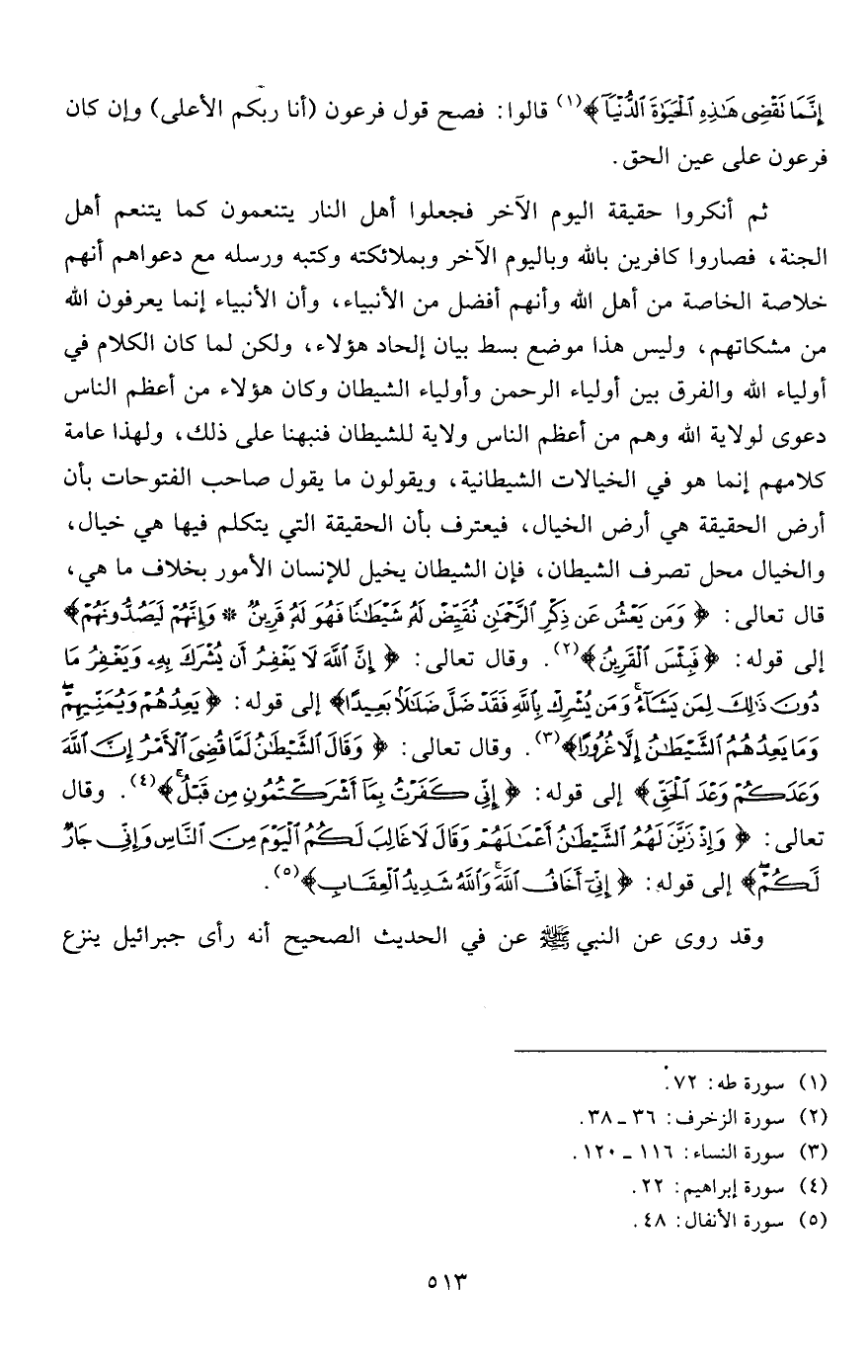 ثم أنكروا حقيقة اليوم الآخر فجعلوا أهل النار يتنعمون كما يتنعم أهل الجنة، فصاروا كافرين بالله وباليوم الآخر وبملائكته وكتبه ورسله مع دعواهم أنهم خلاصة الخاصة من أهل الله وأنهم أفضل من الأنبياء، وأن الأنبياء إنما يعرفون الله من مشكاتهم، وليس هذا موضع بسط بيان إلحاد هؤلاء، ولكن لما كان الكلام في أولياء الله والفرق بين أولياء الرحمن وأولياء الشيطان وكان هؤلاء من أعظم الناس دعوى لولاية الله وهم من أعظم الناس ولاية للشيطان فنبهنا على ذلك، ولهذا عامة كلامهم إنما هو في الخيالات الشيطانية، ويقولون ما يقول صاحب الفتوحات بأن أرض الحقيقة هي أرض الخيال، فيعترف بأن الحقيقة التي يتكلم فيها هي خيال، والخيال محل تصرف الشيطان، فإن الشيطان يخيل للإنسان الأمور بخلاف ما هي، قال تعالى: {وَمَنْ يَعْشُ عَنْ ذِكْرِ الرَّحْمَنِ نُقَيِّضْ لَهُ شَيْطَاناً فَهُوَ لَهُ قَرِينٌ * وَإِنَّهُمْ لَيَصُدُّونَهُمْ} 2. إلى قوله: {فَبِئْسَ الْقَرِينُ} () . وقال تعالى: {إِنَّ اللَّهَ لا يَغْفِرُ أَنْ يُشْرَكَ بِهِ وَيَغْفِرُ مَا دُونَ ذَلِكَ لِمَنْ يَشَاءُ وَمَنْ يُشْرِكْ بِاللَّهِ فَقَدْ ضَلَّ ضَلالاً بَعِيداً} إلى قوله: {يَعِدُهُمْ وَيُمَنِّيهِمْ وَمَا يَعِدُهُمُ الشَّيْطَانُ إِلَّا غُرُوراً} 3. وقال تعالى: {وَقَالَ الشَّيْطَانُ لَمَّا قُضِيَ الْأَمْرُ إِنَّ اللَّهَ وَعَدَكُمْ وَعْدَ الْحَقِّ} إلى قوله: {إِنِّي كَفَرْتُ بِمَا أَشْرَكْتُمُونِ مِنْ قَبْلُ} 4. وقال تعالى: {) وَإِذْ زَيَّنَ لَهُمُ الشَّيْطَانُ أَعْمَالَهُمْ وَقَالَ لا غَالِبَ لَكُمُ الْيَوْمَ مِنَ النَّاسِ وَإِنِّي جَارٌ لَكُمْ} إلى قوله: {إِنِّي أَخَافُ اللَّهَ وَاللَّهُ شَدِيدُ الْعِقَابِ} 5.