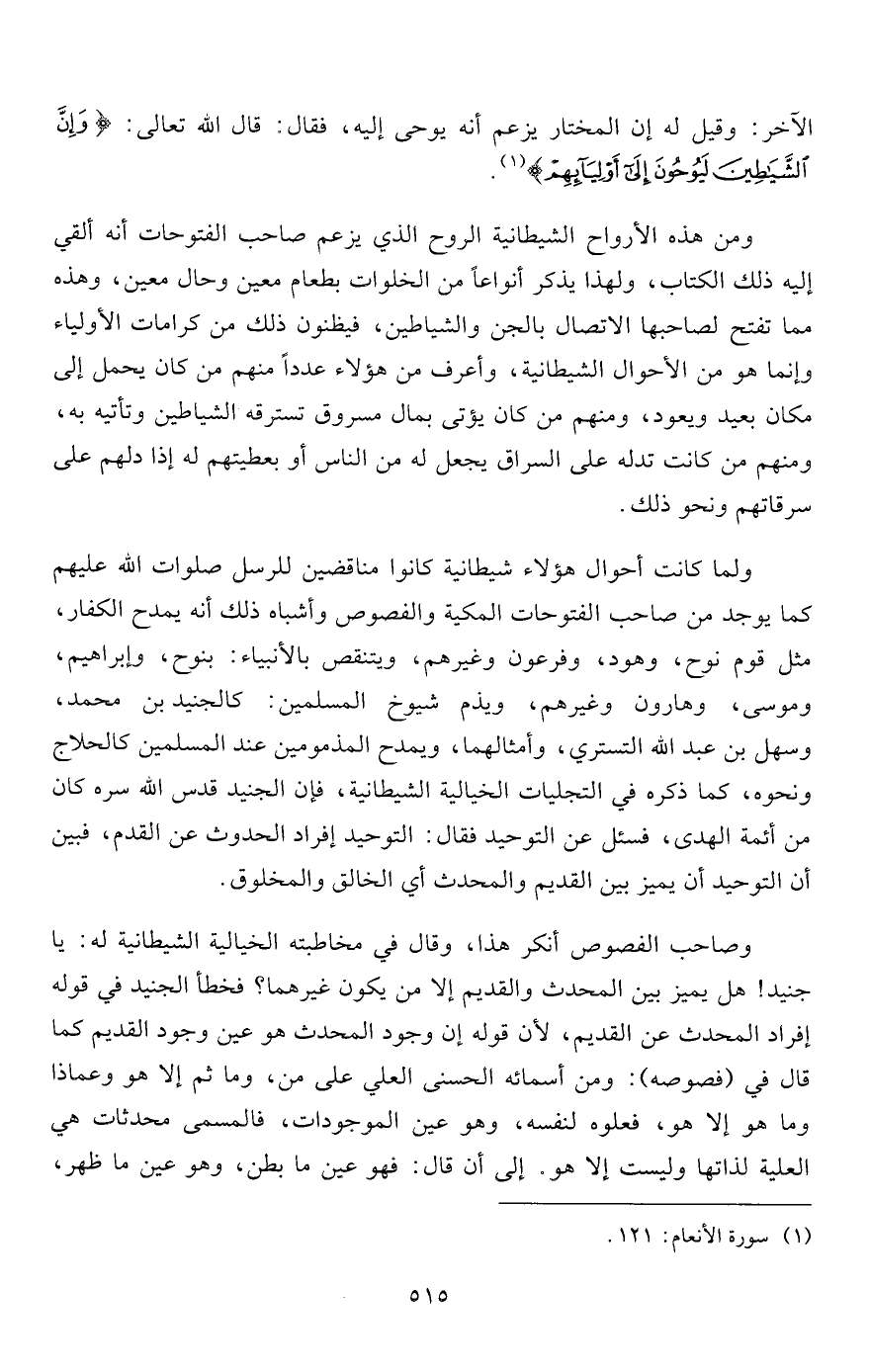 وصاحب الفصوص أنكر هذا، وقال في مخاطبته الخيالية الشيطانية له: يا جنيد! هل يميز بين المحدث والقديم إلا من يكون غيرهما؟ فخطأ الجنيد في قوله إفراد المحدث عن القديم، لألن قوله إن وجود المحدث هو عين وجود القديم كما قال في (فصوصه) : ومن أسمائه الحسنى العلي على من، وما ثم إلا هو وعماذا وما هو إلا هو، فعلوه لنفسه، وهو عين الموجودات، فالمسمى محدثات هي العلية لذاتها وليست إلا هو. إلى أن قال: فهو عين ما بطن، وهو عين ما ظهر،