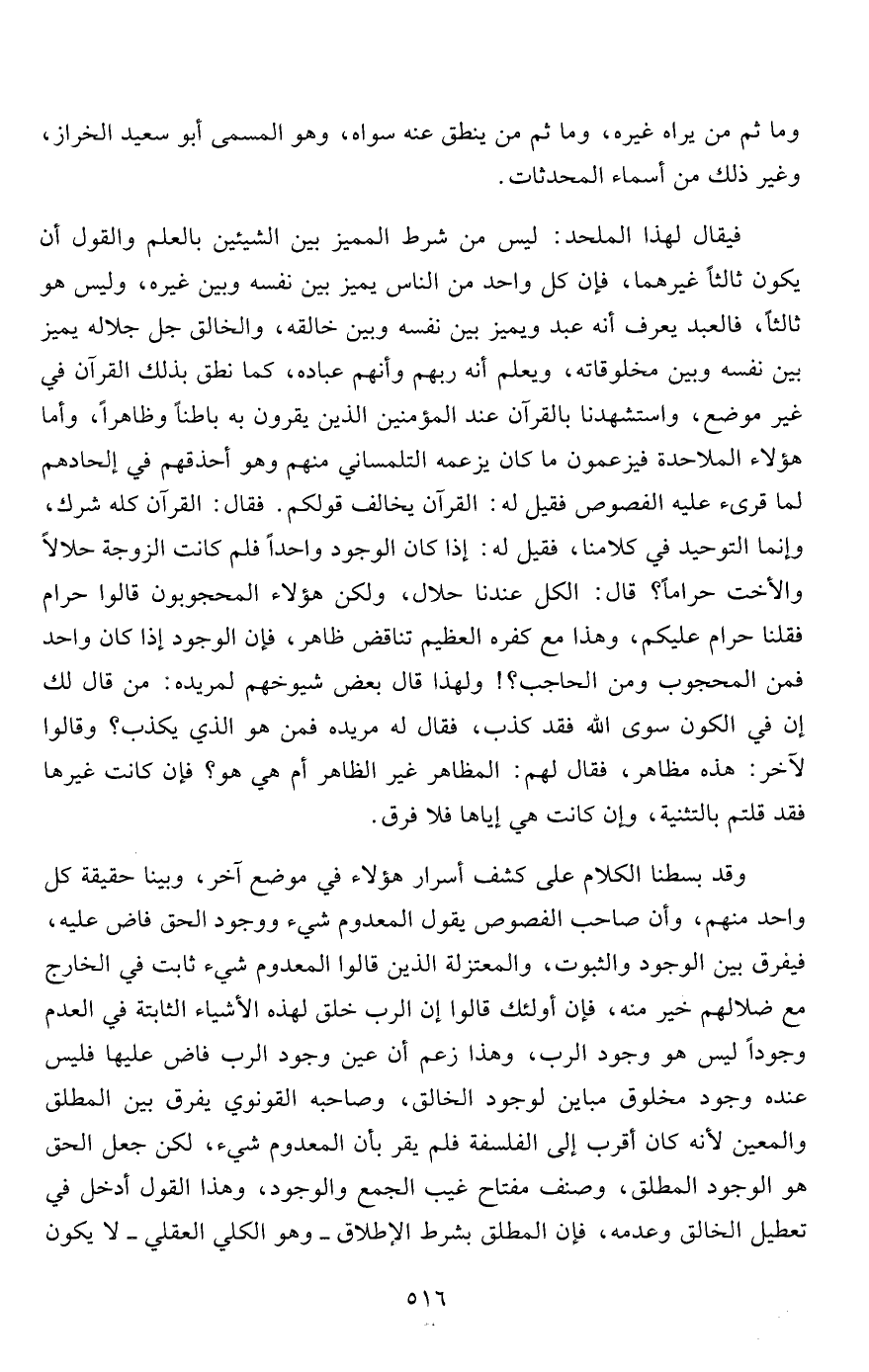 فيقال لهذا الملحد: ليس من شرط المميز بين الشيئين بالعلم والقول أن يكون ثالثاً غيرهما، فإن كل واحد من الناس يميز بين نفسه وبين غيره، وليس هو ثالثاً، فالعبد يحرف أنه عبد ويميز بين نفسه وبين خالقه، والخالق جل جلاله يميز بين نفسه وبين مخلوقاته، ويعلم أنه ربهم وأنهم عباده، كما نطق بذلك القرآن في غير موضع، واستشهدنا بالقرآن عند المؤمنين الذين يقرون به باطناً وظاهراً، وأما هؤلاء الملاحدة فيزعمون ما كان يزعمه التلمساني منهم وهو أحذقهم في إلحادهم لما قرىء عليه الفصوص فقيل له: القرآن يخالف قولكم. فقال: القرآن كله شرك، وإنما التوحيد في كلامنا، فقيل له: إذا كان الوجود واحداً فلم كانت الزوجة حلالاً والأخت حراماً؟ قال: الكل عندنا حلال، ولكن هؤلاء المحجوبون قالوا حرام فقلنا حرام عليكم، وهذا مع كفره العظيم تناقض ظاهر، فإن الوجود إذا كان واحد فمن المحجوب ومن الحاجب؟! ولهذا قال بعض شيوخهم لمريده: من قال لك إن في الكون سوى الله فقد كذب، فقال له مريده فمن هو الذي يكذب؟ وقالوا لآخر: هذه مظاهر، فقال لهم: المظاهر غير الظاهر أم هي هو؟ فإن كانت غيرها فقد قلتم بالتثنية، وإن كانت هي إياها فلا فرق.