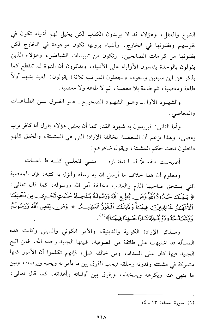 وسنذكر الإرادة الكونية والدينية، والأمر الكوني والديني وكانت هذه المسألة قد اشتبهت على طائفة من الصوفية، فبينها الجنيد رحمه الله، فمن اتبع الجنيد فيها كان على السداد، ومن خالفه ضل، فإنهم تكلموا أن الأمور كلها مشتركة في مشيئته وقدرته وخلقه فيجب الفرق بين ما يأمر به ويحبه ويرضاه، وبين ما ينهى عنه ويكرهه ويسخطه، ويفرق بين أوليائه وأعدائه، كما قال تعالى: