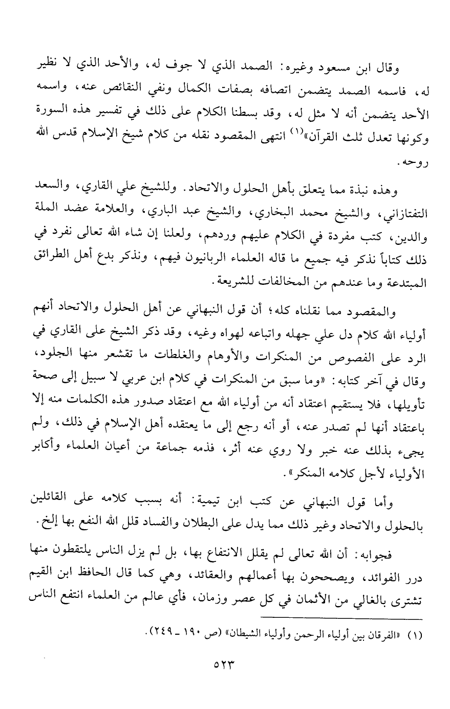 وهذه نبذة مما يتعلق بأهل الحلول والاتحاد. وللشيخ علي القاري، والسعد التفتازاني، والشيخ محمد البخاري، والشيخ عبد الباري، والعلامة عضد الملة والدين، كتب مفردة في الكلام عليهم وردهم، ولعلنا إن شاء الله تعالى نفرد في ذلك كتاباً نذكر فيه جميع ما قاله العلماء الربانيون فيهم، ونذكر بدع أهل الطرائق المبتدعة وما عندهم من المخالفات للشريعة.
