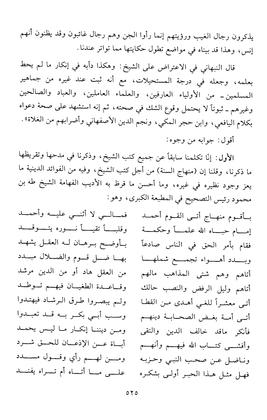 قال النبهاني في الاعتراض على الشيخ: وهكذا دأبه في إنكار ما لم يحط بعلمه، وجعله في درجة المستحيلات، مع أنه ثبت عند غيره من جماهير المسلمين- من الأولياء العارفين، والعلماء العاملين، والعباد والصالحين وغيرهم- ثبوتاً لا يحتمل وقوع الشك في صحته، ثم إنه استشهد على صحة دعواه بكلام اليافعي، وابن حجر المكي، ونجم الدين الأصفهاني وأضرابهم من الغلاة".