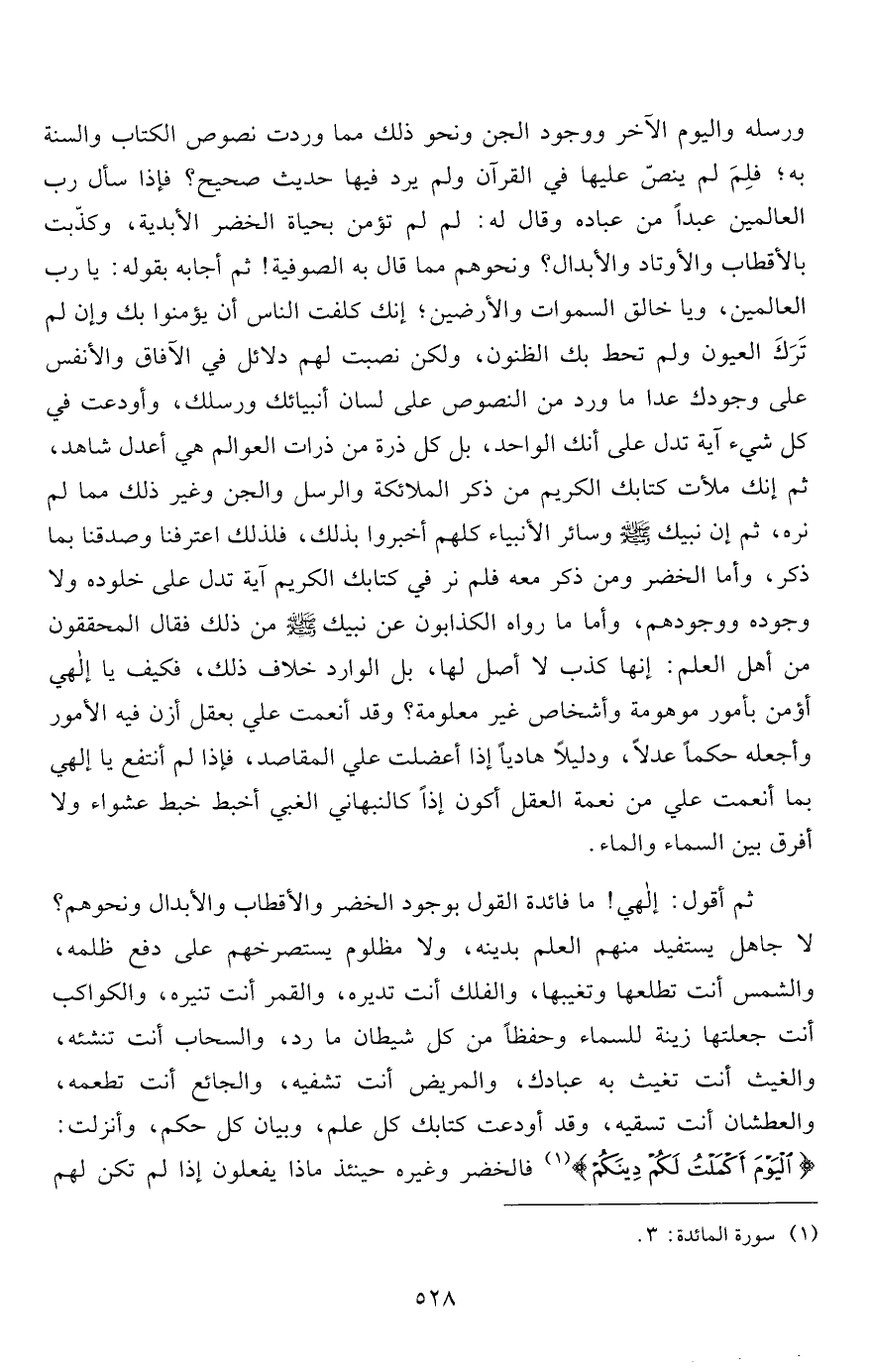 ثم أقول: إلهي! ما فائدة القول بوجود الخضر والأقطاب والأبدال ونحوهم؟ لا جاهل يستفيد منهم العلم بدينه، ولا مظلوم يستصرخهم على دفع ظلمه، والشمس أنت تطلعها وتغيبها، والفلك أنت تديره، والقمر أنت تنيره، والكواكب أنت جعلتها زينة للسماء وحفظاً من كل شيطان ما رد، والسحاب أنت تنشئه، والغيث أنت تغيث به عبادك، والمريض أنت تشفيه، والجائع أنت تطعمه، والعطشان أنت تسقيه، وقد أودعت كتابك كل علم، وبيان كل حكم، وأنزلت: {الْيَوْمَ أَكْمَلْتُ لَكُمْ دِينَكُمْ} 1 فالخضر وغيره حينئذ ماذا يفعلون إذا لم تكن لهم