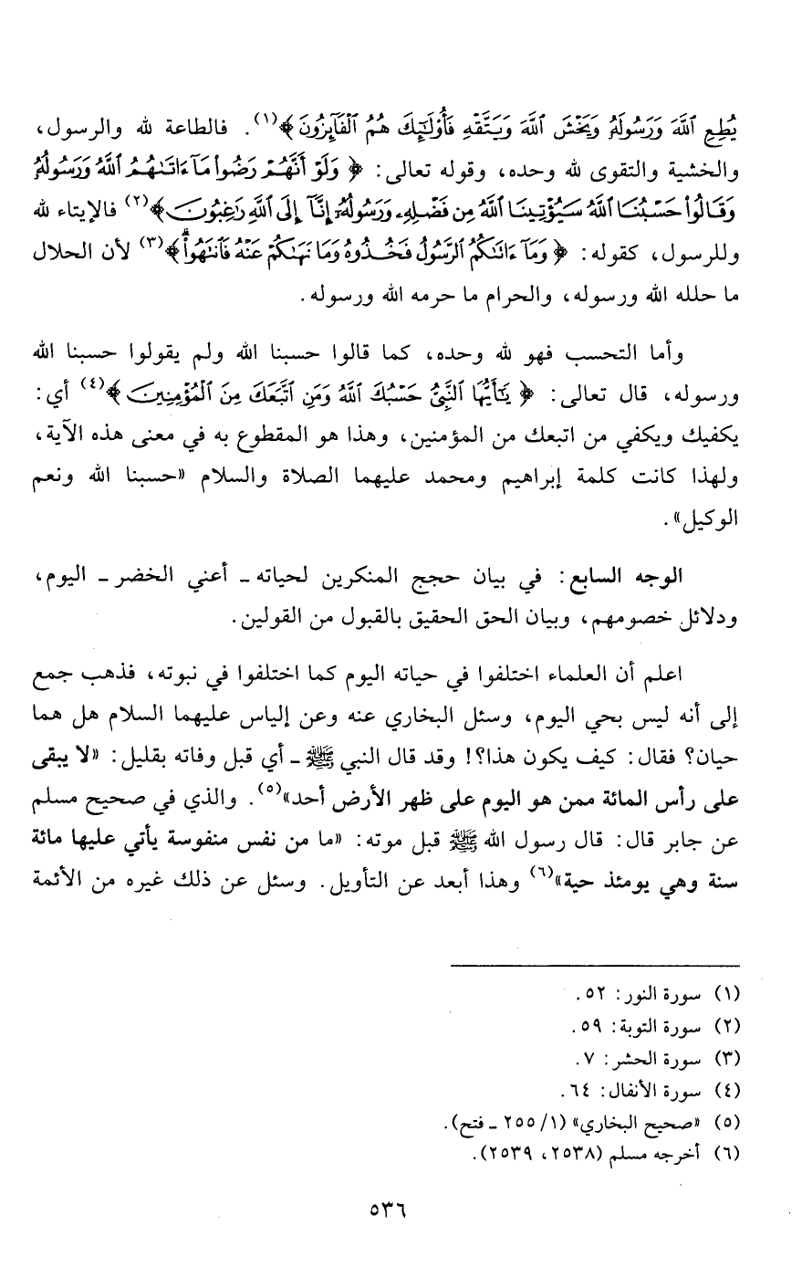 الوجه السابع: في بيان حجج المنكرين لحياته- أعني الخضر- اليوم، ودلائل خصومهم، وبيان الحق الحقيق بالقبول من القولين.