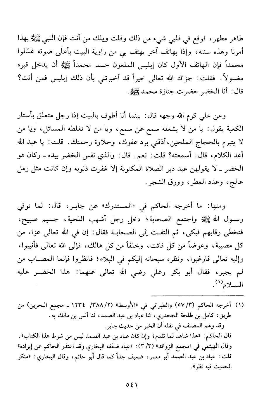 طاهر مطهر، فوقع في قلبي شيء من ذلك وقلت ويلك من أنت فإن النبي صلى الله عليه وسلم بهذا أمرنا وهذه سنته، وإذا بهاتف آخر يهتف بي من زاوية البيت بأعلى صوته غسّلوا محمداً فإن الهاتف الأول كان إبليس الملعون حسد محمداً صلى الله عليه وسلم أن يدخل قبره مغسولاً. فقلت: جزاك الله تعالى خيراً قد أخبرتني بأن ذلك إبليس فمن أنت؟ قال: أنا الخضر حضرت جنازة محمد صلى الله عليه وسلم.