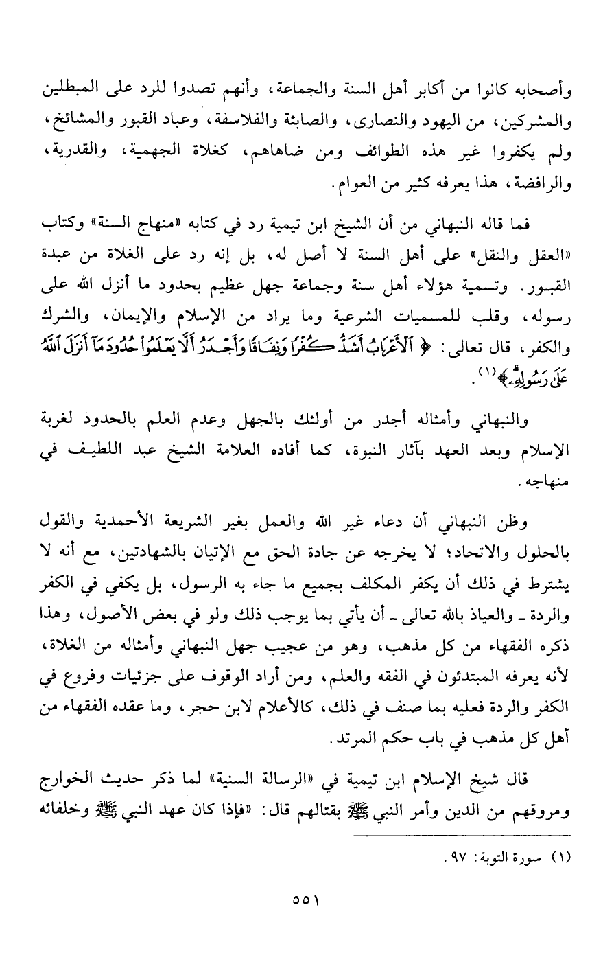 فما قاله النبهاني من أن الشيخ ابن تيمية رد في كتابه "منهاج السنة" وكتاب "العقل والنقل" على أهل السنة لا أصل له، بل إنه رد على الغلاة من عبدة القبور. وتسمية هؤلاء أهل سنة وجماعة جهل عظيم بحدود ما أنزل الله على رسوله، وقلب للمسميات الشرعية وما يراد من الإسلام والإيمان، والشرك والكفر، قال تعالى: {الْأَعْرَابُ أَشَدُّ كُفْراً وَنِفَاقاً وَأَجْدَرُ أَلّا يَعْلَمُوا حُدُودَ مَا أَنْزَلَ اللَّهُ عَلَى رَسُولِهِ} 1.