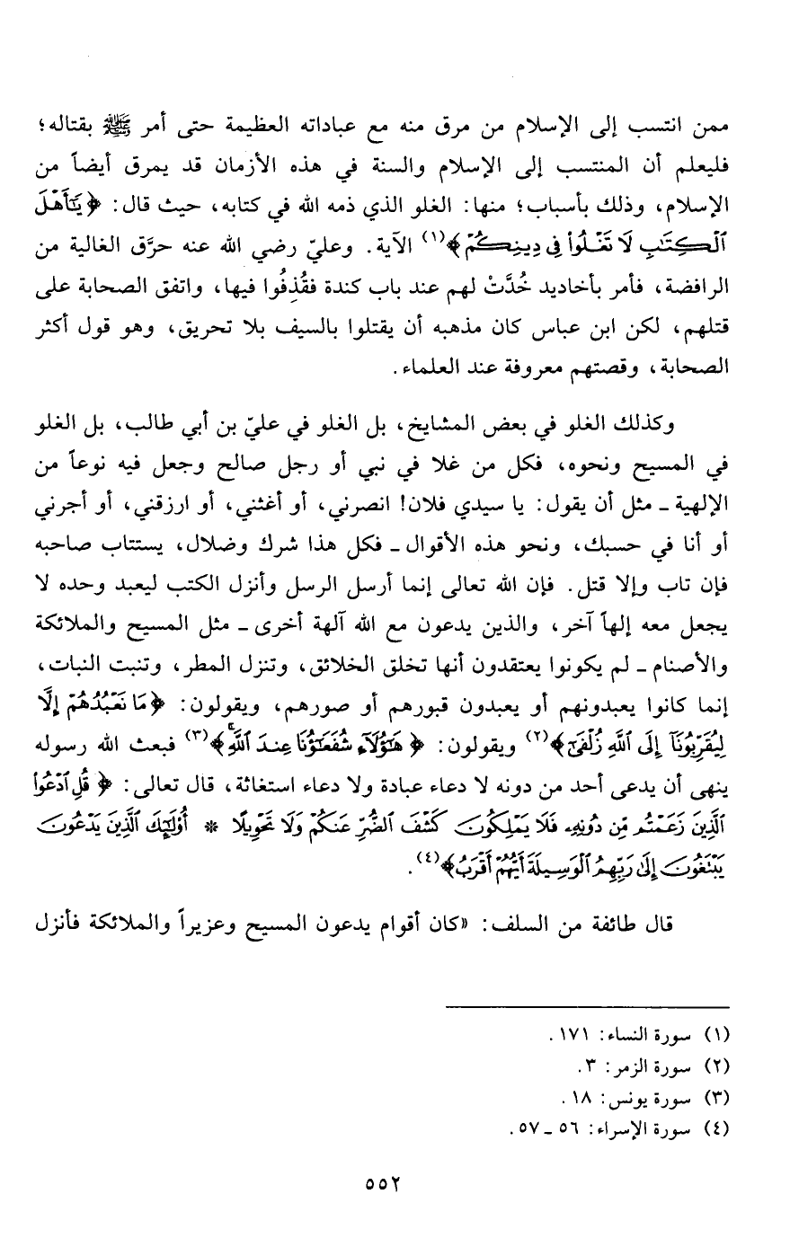 وكذلك الغلو في بعض المشايخ، بل الغلو في عليّ بن أبي طالب، بل الغلو في المسيح ونحوه، فكل من غلا في نبي أو رجل صالح وجعل فيه نوعاً من الإلهية- مثل أن يقول: يا سيدي فلان! انصرني، أو أغثني، أو ارزقني، أو أجرني أو أنا في حسبك، ونحو هذه الأقوال- فكل هذا شرك وضلال، يستتاب صاحبه فإن تاب وإلا قتل. فإن الله تعالى إنما أرسل الرسل وأنزل الكتب ليعبد وحده لا يجعل معه إلهاً آخر، والذين يدعون مع الله آلهة أخرى- مثل المسيح والملائكة والأصنام- لم يكونوا يعتقدون أنها تخلق الخلائق، وتنزل المطر، وتنبت النبات، إنما كانوا يعبدونهم أو يعبدون قبورهم أو صورهم، ويقولون: {مَا نَعْبُدُهُمْ إِلَّا لِيُقَرِّبُونَا إِلَى اللَّهِ زُلْفَى} 2 ويقولون: {هَؤُلاءِ شُفَعَاؤُنَا عِنْدَ اللَّهِ} 3 فبعث الله رسوله ينهى أن يدعى أحد من دونه لا دعاء عبادة ولا دعاء استغاثة، قال تعالى: {قُلِ ادْعُوا الَّذِينَ زَعَمْتُمْ مِنْ دُونِهِ فَلا يَمْلِكُونَ كَشْفَ الضُّرِّ عَنْكُمْ وَلا تَحْوِيلاً * أُولَئِكَ الَّذِينَ يَدْعُونَ يَبْتَغُونَ إِلَى رَبِّهِمُ الْوَسِيلَةَ أَيُّهُمْ أَقْرَبُ} 4.