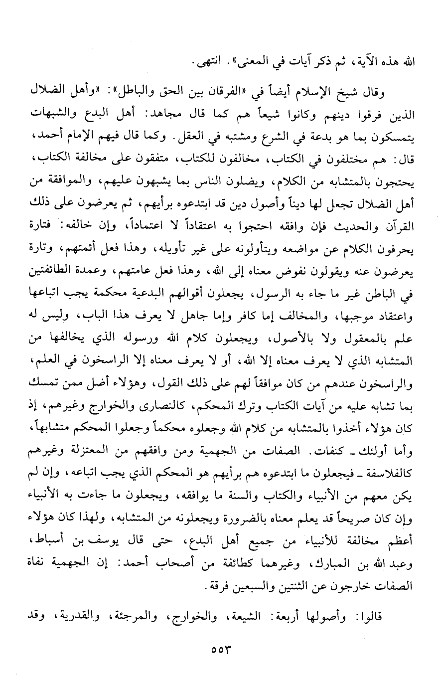 وقال شيخ الإسلام أيضاً في "الفرقان بين الحق والباطل": "وأهل الضلال الذين فرقوا دينهم وكانوا شيعاً هم كما قال مجاهد: أهل البدع والشبهات يتمسكون بما هو بدعة في الشرع ومشتبه في العقل. وكما قال فيهم الإمام أحمد، قال: هم مختلفون في الكتاب، مخالفون للكتاب، متفقون على مخالفة الكتاب، يحتجون بالمتشابه من الكلام، ويضلون الناس بما يشبهون عليهم، والموافقة من أهل الضلال تجعل لها ديناً وأصول دين قد ابتدعوه برأيهم، ثم يعرضون على ذلك القرآن والحديث فإن وافقه احتجوا به اعتقاداً لا اعتماداً، وإن خالفه: فتارة يحرفون الكلام عن مواضعه ويتأولونه على غير تأويله، وهذا فعل أئمتهم، وتارة يعرضون عنه ويقولون نفوض معناه إلى الله، وهذا فعل عامتهم، وعمدة الطائفتين في الباطن غير ما جاء به الرسول، يجعلون أقوالهم البدعية محكمة يجب اتباعها واعتقاد موجبها، والمخالف إما كافر وإما جاهل لا يعرف هذا الباب، وليس له علم بالمعقول ولا بالأصول، ويجعلون كلام الله ورسوله الذي يخالفها من المتشابه الذي لا يعرف معناه إلا الله، أو لا يعرف معناه إلا الراسخون في العلم، والراسخون عندهم من كان موافقاً لهم على ذلك القول، وهؤلاء أضل ممن تمسك بما تشابه عليه من آيات الكتاب وترك المحكم، كالنصارى والخوارج وغيرهم، إذ كان هؤلاء أخذوا بالمتشابه من كلام الله وجعلوه محكماً وجعلوا المحكم متشابها، وأما أولئك -كنفات. الصفات من الجهمية ومن وافقهم من المعتزلة وغيرهم كالفلاسفة- فيجعلون ما ابتدعوه هم برأيهم هو المحكم الذي يجب اتباعه، وإن لم يكن معهم من الأنبياء والكتاب والسنة ما يوافقه، ويجعلون ما جاءت في الأنبياء وإن كان صريحاً قد يعلم معناه بالضرورة ويجعلونه من المتشابه، ولهذا كان هؤلاء أعظم مخالفة للأنبياء من جميع أهل البدع، حتى قال يوسف بن أسباط، وعبد الله بن المبارك، وغيرهما كطائفة من أصحاب أحمد: إن الجهمية نفاة الصفات خارجون عن الثنتين والسبعين فرقة.