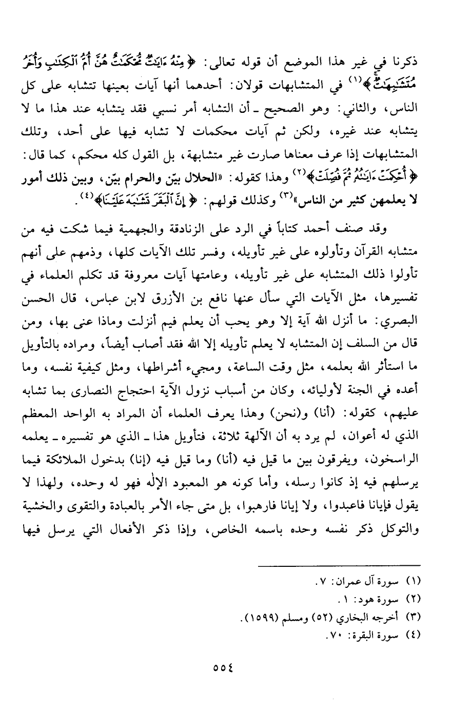 وقد صنف أحمد كتاباً في الرد على الزنادقة والجهمية فيما شكت فيه من متشابه القرآن وتأولوه على غير تأويله، وفسر تلك الآيات كلها، وذمهم على أنهم تأولوا ذلك المتشابه على غير تأويله، وعامتها آيات معروفة قد تكلم العلماء في تفسيرها، مثل الآيات التي سأل عنها نافع بن الأزرق لابن عباس، قال الحسن البصري: ما أنزل الله آية إلا وهو يحب أن يعلم فيم أنزلت وماذا عنى بها، ومن قال من السلف إن المتشابه لا يعلم تأويله إلا الله فقد أصاب أيضاً، ومراده بالتأويل ما استأثر الله بعلمه، مثل وقت الساعة، ومجيء أشراطها، ومثل كيفية نفسه، وما أعده في الجنة لأوليائه، وكان من أسباب نزول الآية احتجاج النصارى بما تشابه عليهم، كقوله: (أنا) و (نحن) وهذا يعرف العلماء أن المراد به الواحد المعظم الذي له أعوان، لم يرد به أن الآلهة ثلاثة، فتأويل هذا- الذي هو تفسيره- يعلمه الراسخون، ويفرقون بين ما قيل فيه (أنا) وما قيل فيه (إنا) بدخول الملائكة فيما يرسلهم فيه إذ كانوا رسله، وأما كونه هو المعبود الإله فهو له وحده، ولهذا لا يقول فإيانا فاعبدوا، ولا إيانا فارهبوا، بل متى جاء الأمر بالعبادة والتقوى والخشية والتوكل ذكر نفسه وحده باسمه الخاص، وإذا ذكر الأفعال التي يرسل فيها