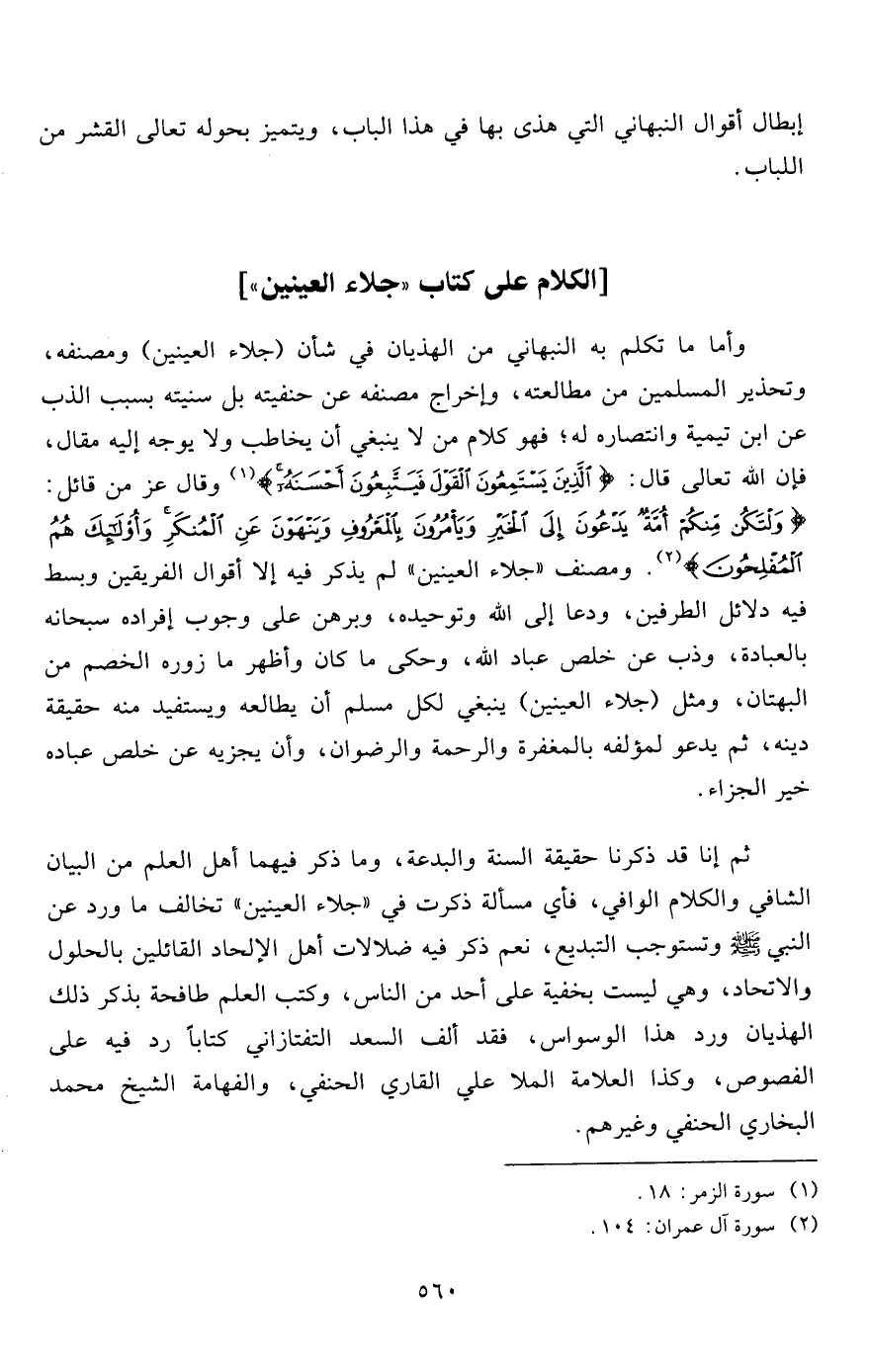 وأما ما تكلم به النبهاني من الهذيان في شأن (جلاء العينين) ومصنفه، وتحذير المسلمين من مطالعته، وإخراج مصنفه عن حنفيته بل سنيته بسبب الذب عن ابن تيمية وانتصاره له؛ فهو كلام من لا ينبغي أن يخاطب ولا يوجه إليه مقال، فإن الله تعالى قال: {الَّذِينَ يَسْتَمِعُونَ الْقَوْلَ فَيَتَّبِعُونَ أَحْسَنَهُ} 1 وقال عز من قائل: {وَلْتَكُنْ مِنْكُمْ أُمَّةٌ يَدْعُونَ إِلَى الْخَيْرِ وَيَأْمُرُونَ بِالْمَعْرُوفِ وَيَنْهَوْنَ عَنِ الْمُنْكَرِ وَأُولَئِكَ هُمُ الْمُفْلِحُونَ} 2. ومصنف "جلاء العينين" لم يذكر فيه إلا أقوال الفريقين وبسط فيه دلائل الطرفين، ودعا إلى الله وتوحيده، وبرهن على وجوب إفراده سبحانه بالعبادة، وذب عن خلص عباد الله، وحكى ما كان وأظهر ما زوره الخصم من البهتان، ومثل (جلاء العينين) ينبغي لكل مسلم أن يطالعه ويستفيد منه حقيقة دينه، ثم يدعو لمؤلفه بالمغفرة والرحمة والرضوان، وأن يجزيه عن خلص عباده خير الجزاء.