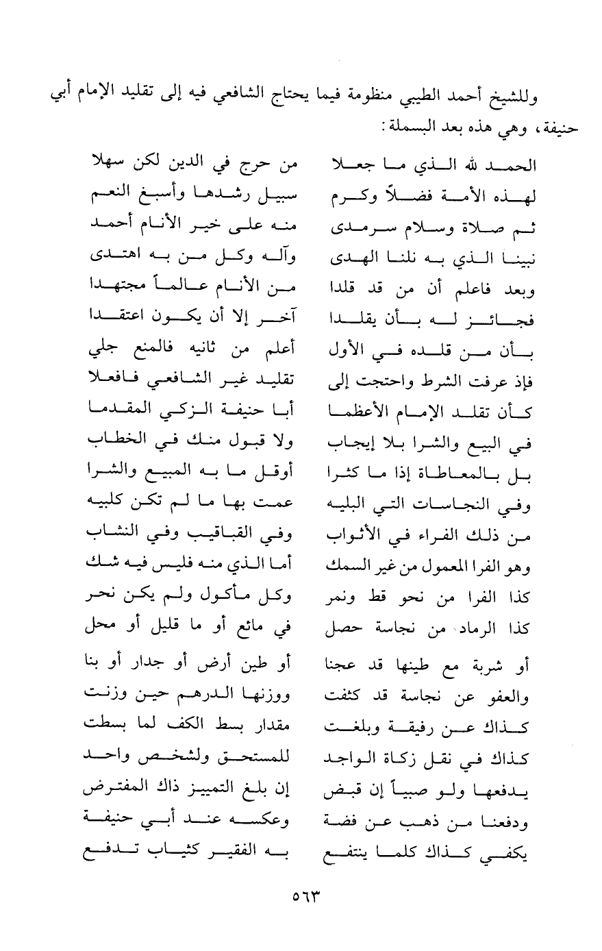 وللشيخ أحمد الطيبي منظومة فيما يحتاج الشافعي فيه إلى تقليد الإمام أبي حنيفة، وهي هذه بعد البسملة: