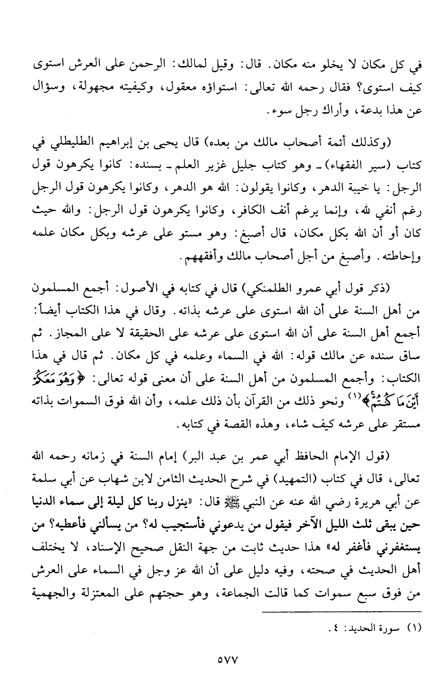 (قول الإمام الحافظ أبي عمر بن عبد البر) إمام السنة في زمانه رحمه الله تعالى، قال في كتاب (التمهيد) في شرح الحديث الثامن لابن شهاب عن أبي سلمة عن أبي هريرة رضي الله عنه عن النبي صلى الله عليه وسلم قال: "ينزل ربنا كل ليلة إلى سماء الدنيا حين يبقى ثلث الليل الآخر فيقول من يدعوني فأستجيب له؟ من يسألني فأعطيه؟ من يستغفرني فأغفر له" هذا حديث ثابت من جهة النقل صحيح الإسناد، لا يختلف أهل الحديث في صحته، وفيه دليل على أن الله عز وجل في السماء على العرش من فوق سبع سموات كما قالت الجماعة، وهو حجتهم على المعتزلة والجهمية