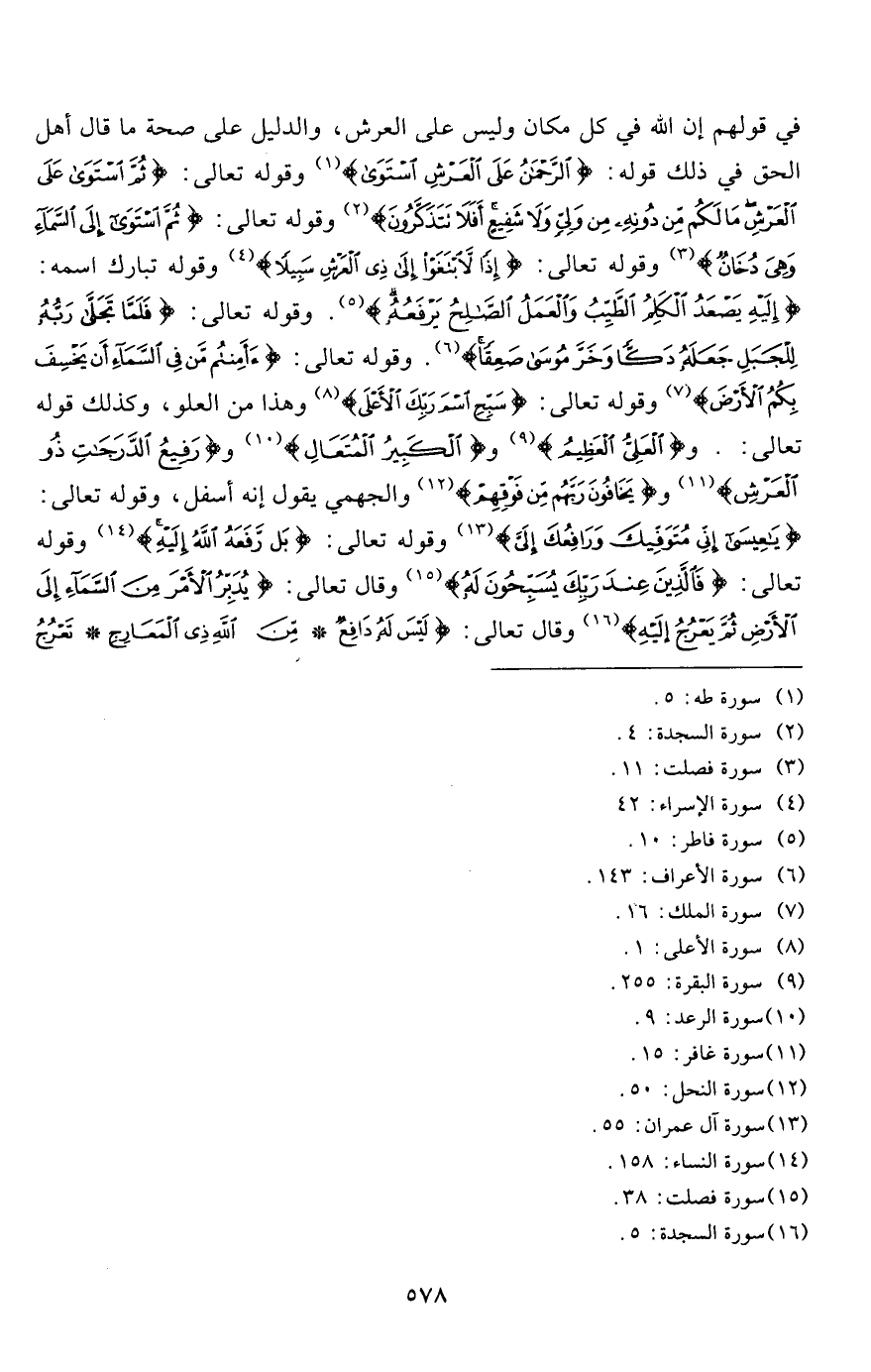 في قولهم إن الله في كل مكان وليس على العرش، والدليل على صحة ما قال أهل الحق في ذلك قوله: {الرَّحْمَنُ عَلَى الْعَرْشِ اسْتَوَى} 1 وقوله تعالى: {ثُمَّ اسْتَوَى عَلَى الْعَرْشِ ثُمَّ اسْتَوَى إِلَى السَّمَاءِ وَهِيَ دُخَانٌ مَا لَكُمْ مِنْ دُونِهِ مِنْ وَلِيٍّ وَلا شَفِيعٍ أَفَلا تَتَذَكَّرُونَ} 2 وقوله تعالى: {ثُمَّ اسْتَوَى إِلَى السَّمَاءِ وَهِيَ دُخَانٌ} 3 وقوله تعالى: {إِذاً لَابْتَغَوْا إِلَى ذِي الْعَرْشِ سَبِيلاً} 4 وقوله تبارك اسمه: {إِلَيْهِ يَصْعَدُ الْكَلِمُ الطَّيِّبُ وَالْعَمَلُ الصَّالِحُ يَرْفَعُهُ} 5. وقوله تعالى: {فَلَمَّا تَجَلَّى رَبُّهُ لِلْجَبَلِ جَعَلَهُ دَكّاً وَخَرَّ مُوسَى صَعِقاً} 6. وقوله تعالى: {أَأَمِنْتُمْ مَنْ فِي السَّمَاءِ أَنْ يَخْسِفَ بِكُمُ الْأَرْضَ} 7 وقوله تعالى: {سَبِّحِ اسْمَ رَبِّكَ الْأَعْلَى} 8 وهذا من العلو، وكذلك قوله تعالى: {الْعَلِيُّ الْعَظِيمُ} 9 و {الْكَبِيرُ الْمُتَعَالِ} 10 و {رَفِيعُ الدَّرَجَاتِ ذُو الْعَرْش} 1 1 و {يَخَافُونَ رَبَّهُمْ مِنْ فَوْقِهِمْ} 12 والجهمي يقول إنه أسفل، وقوله تعالى: {يَا عِيسَى إِنِّي مُتَوَفِّيكَ وَرَافِعُكَ إِلَيَّ} 1 3 وقوله تعالى: {بَلْ رَفَعَهُ اللَّهُ إِلَيْهِ} 14 وقوله تعالى: {فَالَّذِينَ عِنْدَ رَبِّكَ يُسَبِّحُونَ لَهُ} 15 وقال تعالى: {يُدَبِّرُ الْأَمْرَ مِنَ السَّمَاءِ إِلَى الْأَرْضِ ثُمَّ يَعْرُجُ إِلَيْهِ} 16 وقال تعالى: {لَيْسَ لَهُ دَافِعٌ * مِنَ اللَّهِ ذِي الْمَعَارِجِ * تَعْرُجُ