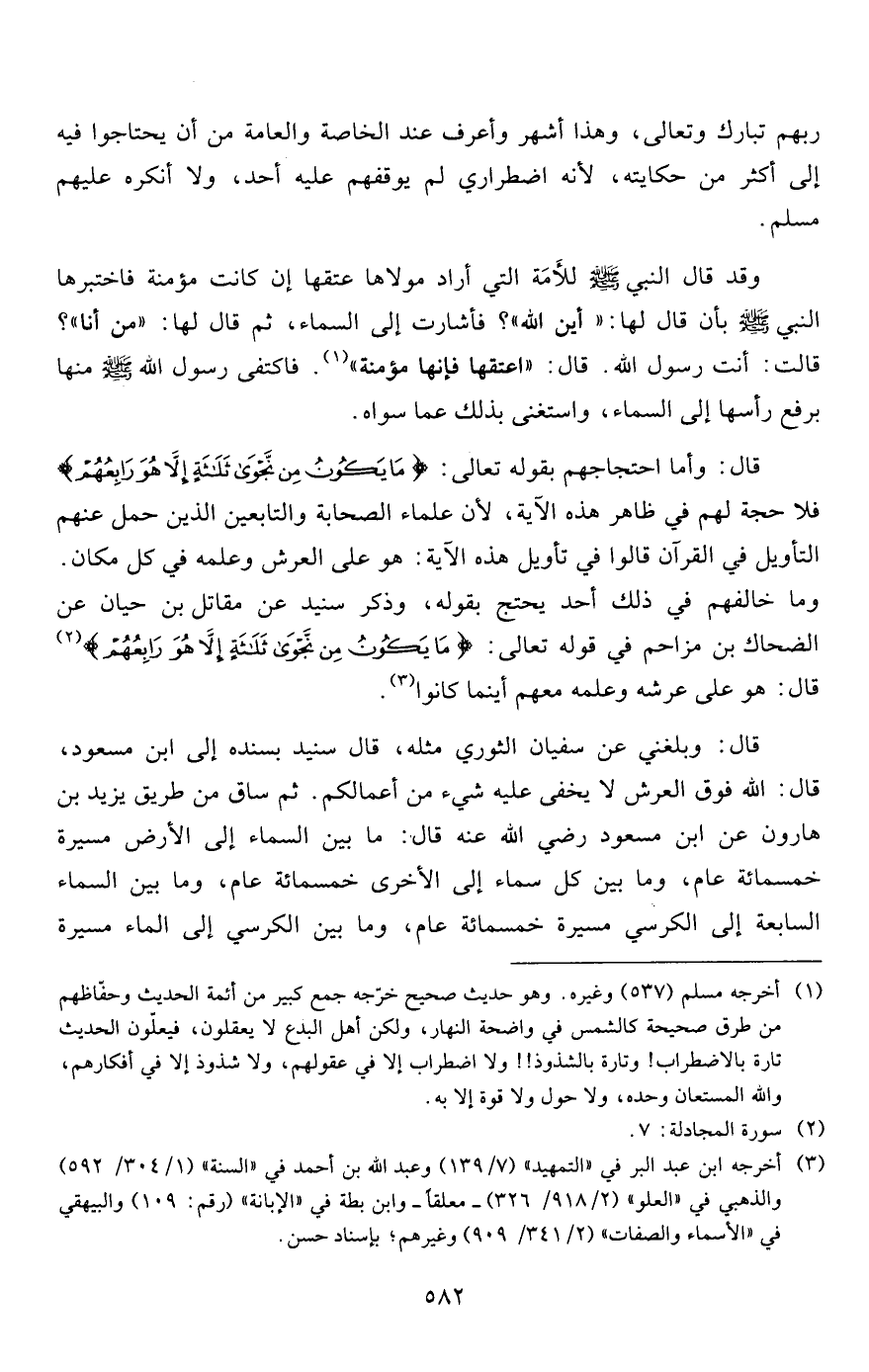 قال: وأما احتجاجهم بقوله تعالى: {مَا يَكُونُ مِنْ نَجْوَى ثَلاثَةٍ إِلَّا هُوَ رَابِعُهُمْ} فلا حجة لهم في ظاهر هذه الآية، لأن علماء الصحابة والتابعين الذين حمل عنهم التأويل في القرآن قالوا في تأويل هذه الآية: هو على العرش وعلمه في كل مكان.