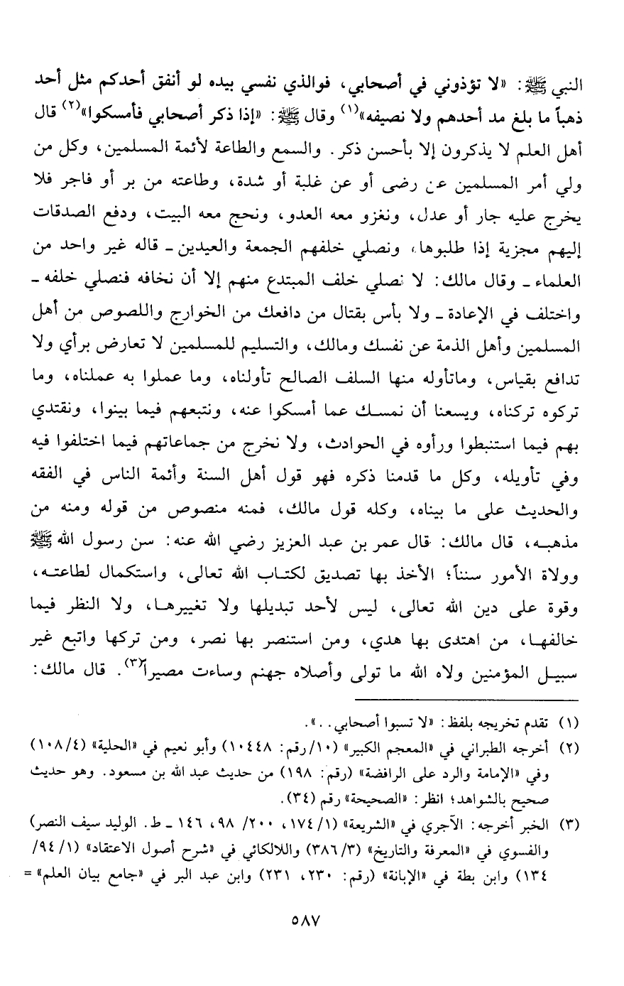 3 الخبر أخرجه: الآجري في "الشريعة" (1/174، 200/ 98، 146- ط. الوليد سيف النصر) والفسوي في "المعرفة والتاريخ" (3/ 386) واللالكاني في "شرح أصول الاعتقاد" (1/94/134) وابن بطة في "الإبانة" (رقم: 230، 231) وابن عبد البر في "جامع بيان العلم" (2/1176/ 2326) والخلال في "السنة" (4/127/1329) والخطيب البغدادي في "الفقيه والمتفقه" (1/435-436/455) وفي "شرف أصحاب الحديث" (رقم:50) . وهو أثر صحيح.