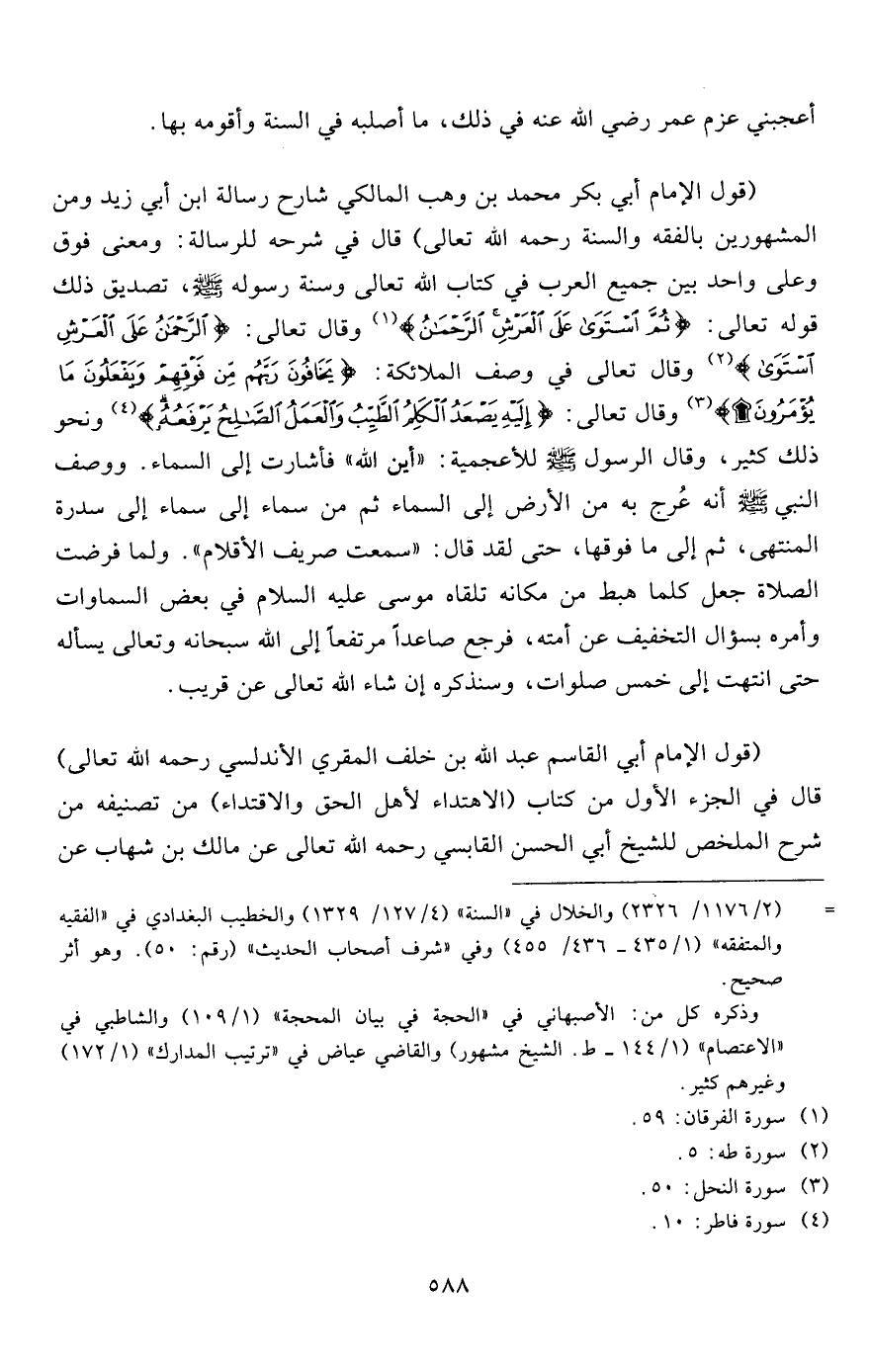 (قول الإمام أبي بكر محمد بن وهب المالكي شارح رسالة ابن أبي زيد ومن المشهورين بالفقه والسنة رحمه الله تعالى) قال في شرحه للرسالة: ومعنى فوق وعلى واحد بين جميع العرب في كتاب الله تعالى وسنة رسوله صلى الله عليه وسلم، تصديق ذلك قوله تعالى: {ثُمَّ اسْتَوَى عَلَى الْعَرْشِ الرَّحْمَنُ} 1 وقال تعالى: {الرَّحْمَنُ عَلَى الْعَرْشِ اسْتَوَى} 2 وقال تعالى في وصف الملائكة: {يَخَافُونَ رَبَّهُمْ مِنْ فَوْقِهِمْ وَيَفْعَلُونَ مَا يُؤْمَرُونَ} 3 وقال تعالى: {إِلَيْهِ يَصْعَدُ الْكَلِمُ الطَّيِّبُ وَالْعَمَلُ الصَّالِحُ يَرْفَعُهُ} 4 ونحو ذلك كثير، وقال الرسول صلى الله عليه وسلم للأعجمية: "أين الله " فأشارت إلى السماء. ووصف النبي صلى الله عليه وسلم أنه عرج به من الأرض إلى السماء ثم من سماء إلى سماء إلى سدرة المنتهى، ثم إلى ما فوقها، حتى لقد قال: "سمعت صريف الأقلام". ولما فرضت الصلاة جعل كلما هبط من مكانه تلقاه موسى عليه السلام في بعض السماوات وأمره بسؤال التخفيف عن أمته، فرجع صاعداً مرتفعاً إلى الله سبحانه وتعالى يسأله حتى انتهت إلى خمس صلوات، وسنذكره إن شاء الله تعالى عن قريب.