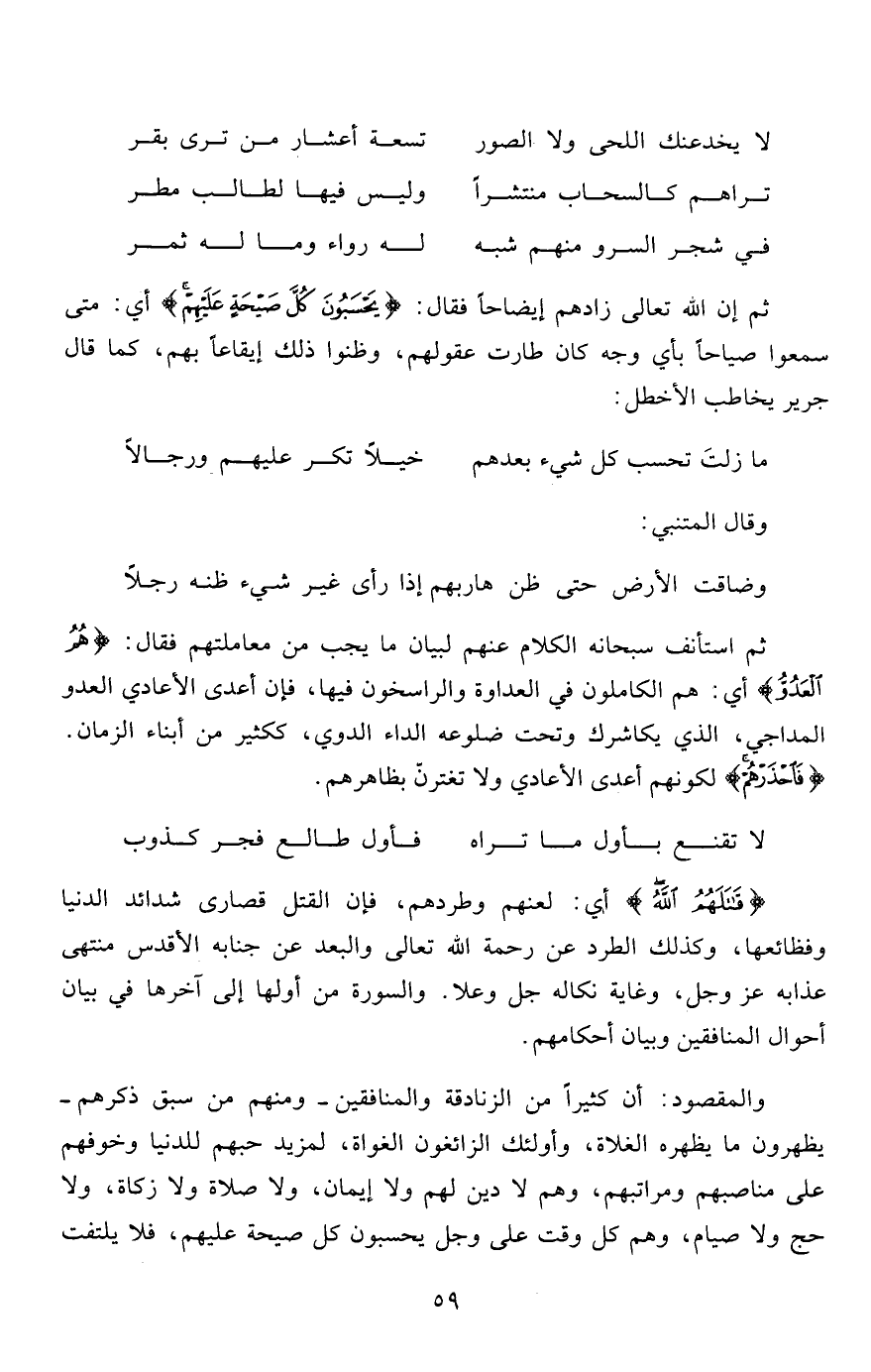 والمقصود: أن كثيراً من الزنادقة والمنافقين -ومنهم من سبق ذكرهم- يظهرون ما يظهره الغلاة، وأولئك الزائغون الغواة، لمزيد حبهم للدنيا وخوفهم على مناصبهم ومراتبهم، وهم لا دين لهم ولا إيمان، ولا صلاة ولا زكاة، ولا حج ولا صيام، وهم كل وقت على وجل يحسبون كل صيحة عليهم، فلا يلتفت