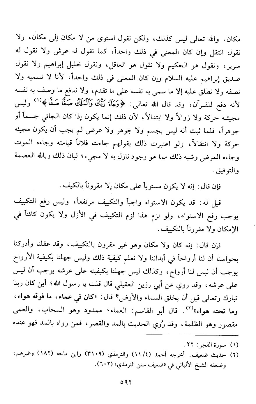 فإن قال: إنه كان ولا مكان وهو غير مقرون بالتكييف، وقد عقلنا وأدركنا بحواسنا أن لنا أرواحاً في أبداننا ولا نعلم كيفية ذلك وليس جهلنا بكيفية الأرواح يوجب أن ليس لنا أرواح، وكذلك ليس جهلنا بكيفيته على عرشه يوجب أن ليس على عرشه، وقد روى عن أبي رزين العقيلي قال قلت يا رسول الله؛ أين كان ربنا تبارك وتعالى قبل أن يخلق السماء والأرض؟ قال: "كان في عماء، ما فوقه هواء، وما تحته هواء" 2. قال أبو القاسم: العماء؛ ممدود وهو السحاب، والعمى مقصور وهو الظلمة، وقد زوي الحديث بالمد والقصر، فمن رواه بالمد فهو عنده