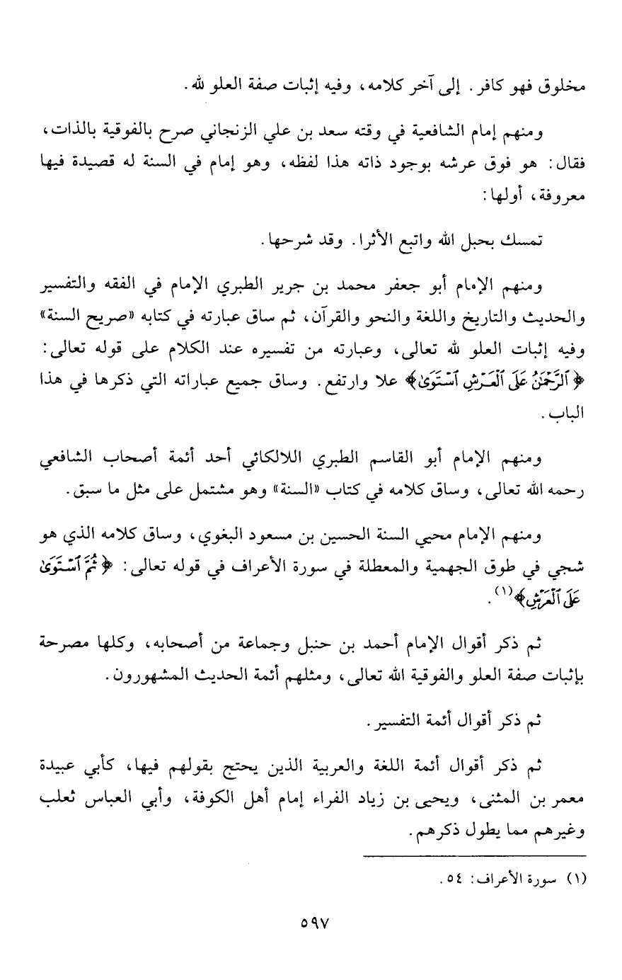 ومنهم الإمام أبو جعفر محمد بن جرير الطبري الإمام في الفقه والتفسير والحديث والتاريخ واللغة والنحو والقرآن، ثم ساق عبارته في كتابه "صريح السنة" وفيه إثبات العلو لله تعالى، وعبارته من تفسيره عند الكلام على قوله تعالى: {الرَّحْمَنُ عَلَى الْعَرْشِ اسْتَوَى} علا وارتفع. وساق جميع عباراته التي ذكرها في هذا الباب.