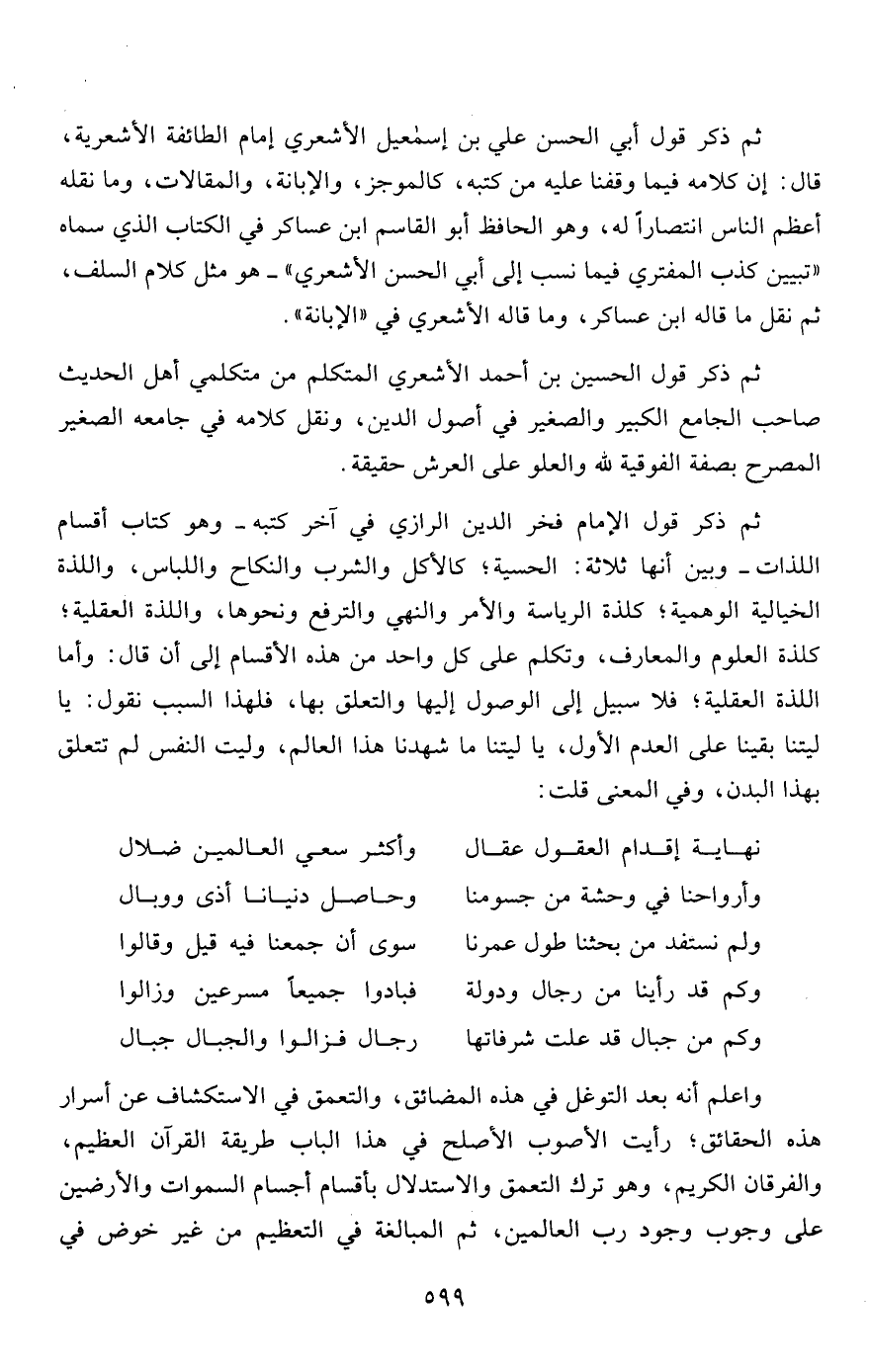 ثم ذكر قول الإمام فخر الدين الرازي في آخر كتبه- وهو كتاب أقسام اللذات- وبين أنها ثلاثة: الحسية؛ كالأكل والشرب والنكاح واللباس، واللذة الخيالية الوهمية؛ كلذة الرياسة والأمر والنهي والترفع ونحوها، واللذة العقلية؛ كلذة العلوم والمعارف، وتكلم على كل واحد من هذه الأقسام إلى أن قال: وأما اللذة العقلية؛ فلا سبيل إلى الوصول إليها والتعلق بها، فلهذا السبب نقول: يا ليتنا بقينا على العدم الأول، يا ليتنا ما شهدنا هذا العالم، وليت النفس لم تتعلق بهذا البدن، وفي المعنى قلت: