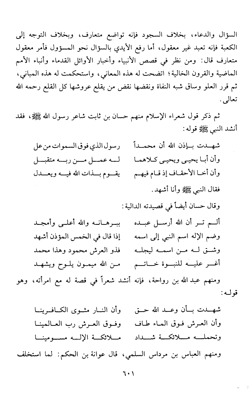 السؤال والدعاء، بخلاف السجود فإنه تواضع متعارف، وبخلاف التوجه إلى الكعبة فإنه تعبد غير معقول، أما رفع الأيدي بالسؤال نحو المسؤول فأمر معقول متعارف قال: ومن نظر في قصص الأنبياء وأخبار الأوائل القدماء وأنباء الأمم الماضية والقرون الخالية؛ اتضحت له هذه المعاني، واستحكمت له هذه المباني، ثم قرر العلو وساق شبه النفاة ونقضها نقض من يقلع عروشها كل القلع رحمه الله تعالى.