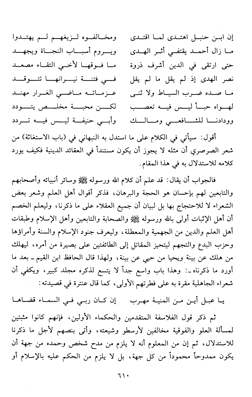 أقول: سيأتي في الكلام على ما استدل به النبهاني في (باب الاستغاثة) من شعر الصرصري أن مثله لا يجوز أن يكون مستنداً في العقائد الدينية فكيف يورد كلامه للاستدلال به في هذا المقام.