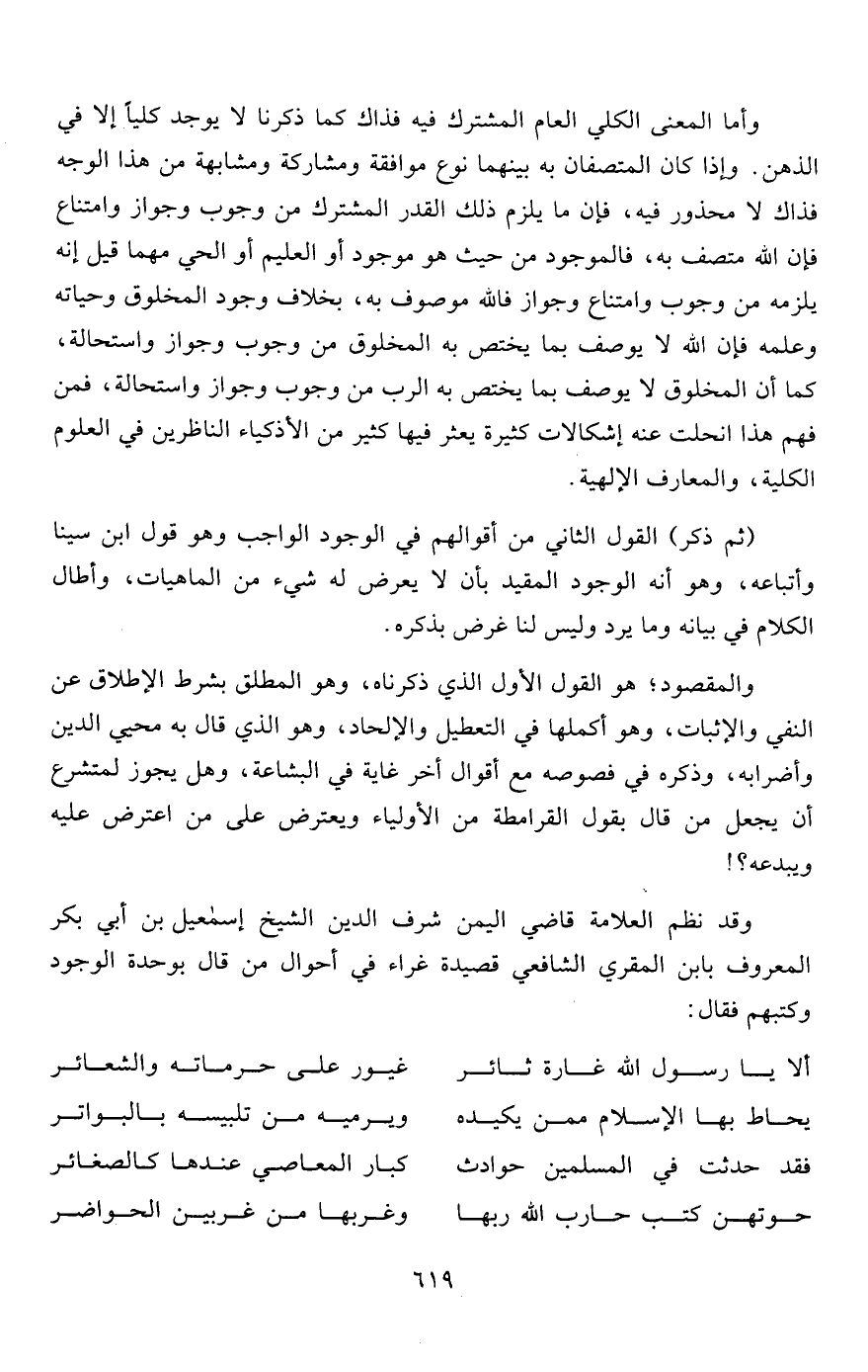 وقد نظم العلامة قاضي اليمن شرف الدين الشيخ إسماعيل بن أبي بكر المعروف بابن المقري الشافعي قصيدة غراء في أحوال من قال بوحدة الوجود وكتبهم فقال:
