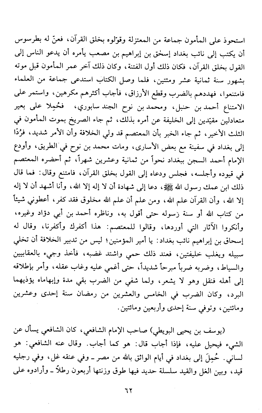 (يوسف بن يحيى البويطي) صاحب الإمام الشافعي، كان الشافعي يسأل عن الشيء فيحيل عليه، فإذا أجاب قال: هو كما أجاب. وقال عنه الشافعي: هو لساني. حُمِلَ إلى بغداد في أيام الواثق بالله من مصر -وفي عنقه غل، وفي رجليه قيد، وبين الغل والقيد سلسلة حديد فيها طوق وزنتها أربعون رطلاً- وأرادوه على