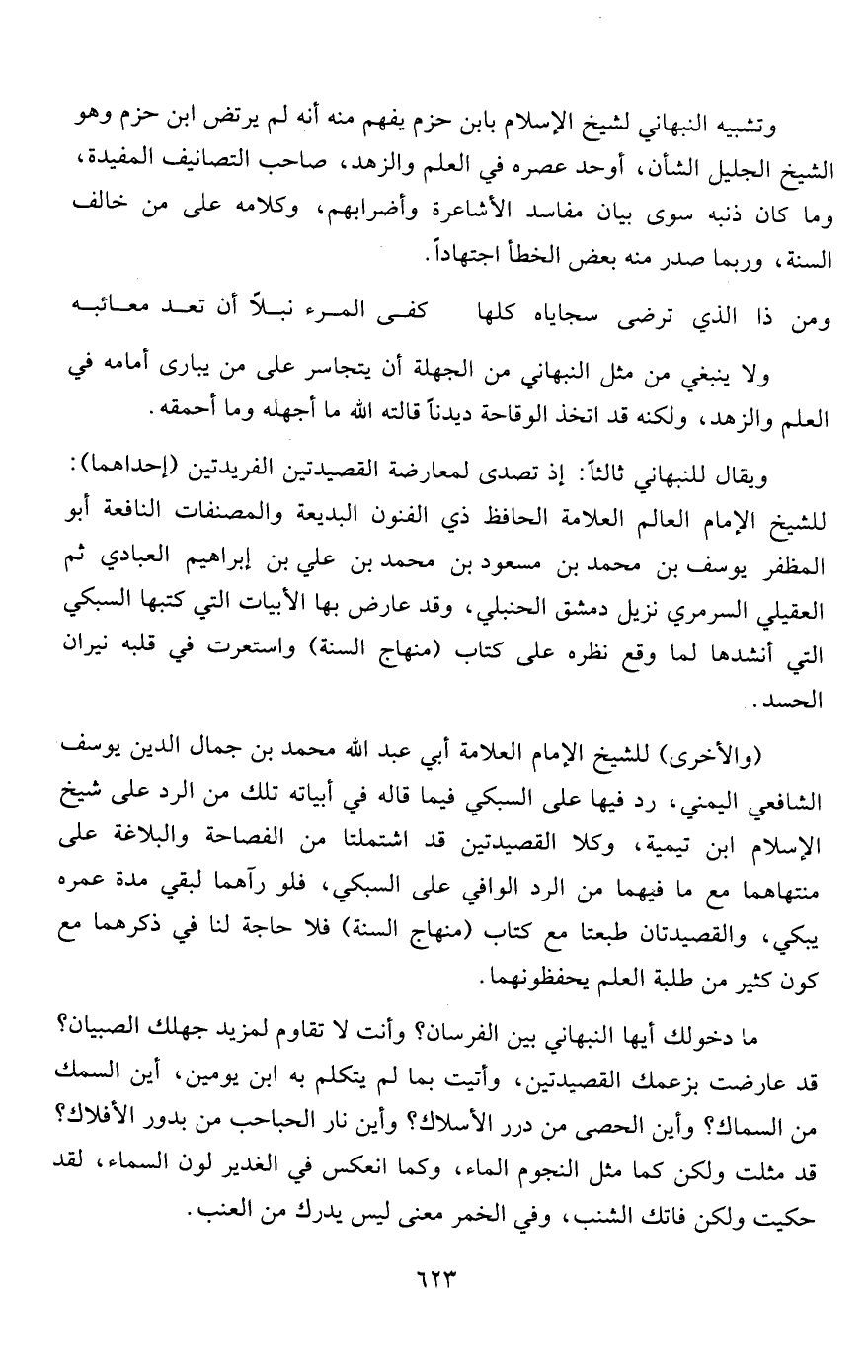 ويقال للنبهاني ثالثاً: إذ تصدى لمعارضة القصيدتين الفريدتين (إحداهما) : للشيخ الإمام العالم العلامة الحافظ ذي الفنون البديعة والمصنفات النافعة أبو المظفر يوسف بن محمد بن مسعود بن محمد بن علي بن إبراهيم العبادي ثم العقيلي السرمري نزيل دمشق الحنبلي، وقد عارض بها الأبيات التي كتبها السبكي التي أنشدها لما وقع نظره على كتاب (منهاج السنة) واستعرت في قلبه نيران الحسد.