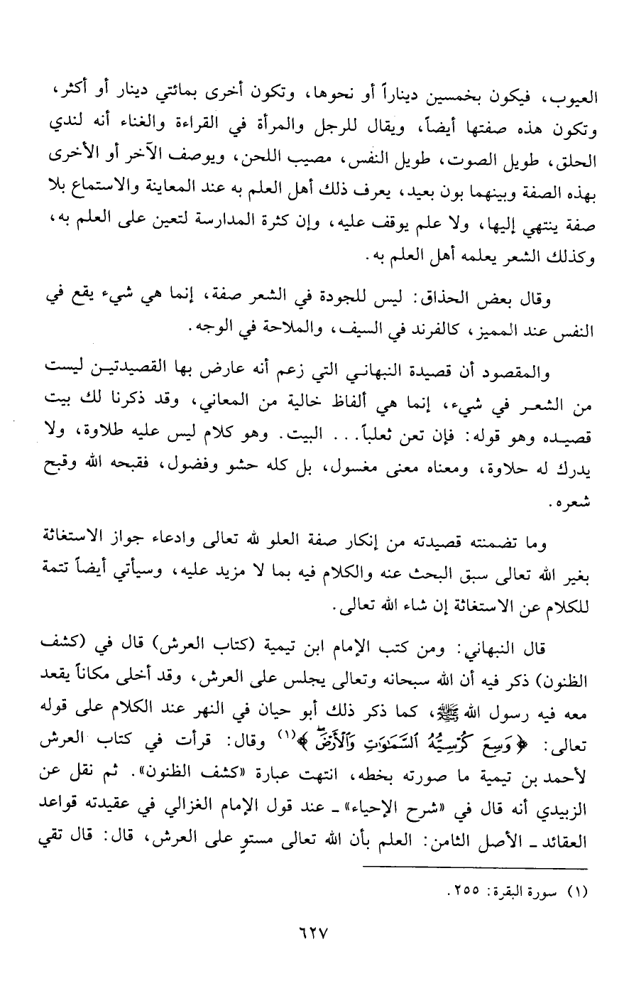قال النبهاني: ومن كتب الإمام ابن تيمية (كتاب العرش) قال في (كشف الظنون) ذكر فيه أن الله سبحانه وتعالى يجلس على العرش، وقد أخلى مكاناً يقعد معه فيه رسول الله صلى الله عليه وسلم، كما ذكر ذلك أبو حيان في النهر عند الكلام على قوله تعالى: {وَسِعَ كُرْسِيُّهُ السَّمَاوَاتِ وَالْأَرْضَ} 1 وقال: قرأت في كتاب العرش لأحمد بن تيمية ما صورته بخطه، انتهت عبارة "كشف الظنون". ثم نقل عن الزبيدي أنه قال في "شرح الإحياء"- عند قول الإمام الغزالي في عقيدته قواعد العقائد- الأصل الثامن: العلم بأن الله تعالى مستوٍ على العرش، قال: قال تقي