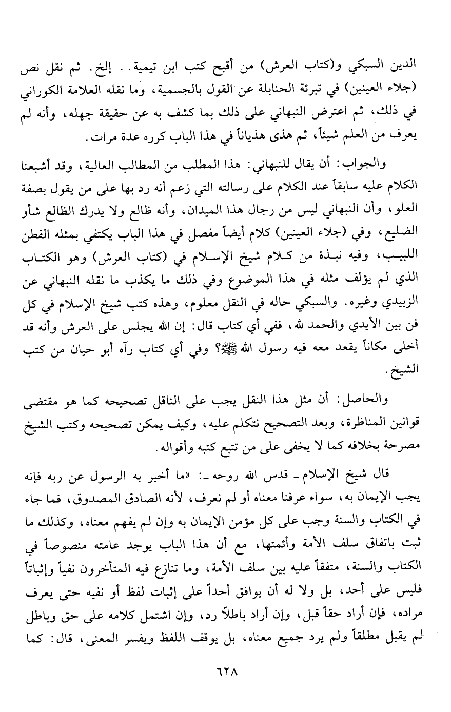 الدين السبكي و (كتاب العرش) من أقبح كتب ابن تيمية.. إلخ. ثم نقل نص (جلاء العينين) في تبرئة الحنابلة عن القول بالجسمية، وما نقله العلامة الكوراني في ذلك، ثم اعترض النبهاني على ذلك بما كشف به عن حقيقة جهله، وأنه لم يعرف من العلم شيئاً، ثم هذى هذياناً في هذا الباب كرره عدة مرات.