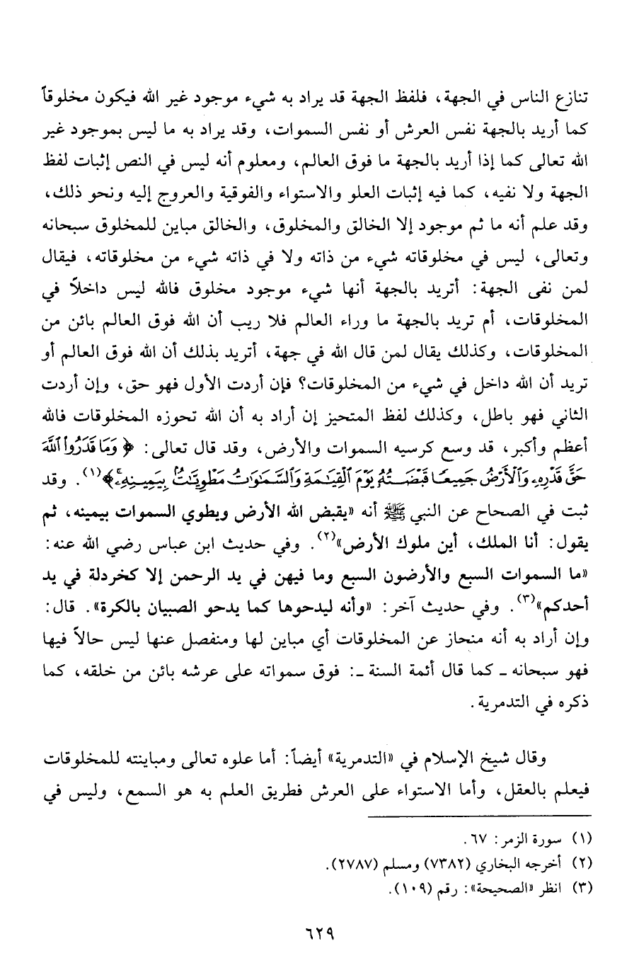 تنازع الناس في الجهة، فلفظ الجهة قد يراد به شيء موجود غير الله فيكون مخلوقاً كما أريد بالجهة نفس العرش أو نفس السموات، وقد يراد به ما ليس بموجود غير الله تعالى كما إذا أريد بالجهة ما فوق العالم، ومعلوم أنه ليس في النص إثبات لفظ الجهة ولا نفيه، كما فيه إثبات العلو والاستواء والفوقية والعروج إليه ونحو ذلك، وقد علم أنه ما ثم موجود إلا الخالق والمخلوق، والخالق مباين للمخلوق سبحانه وتعالى، ليس في مخلوقاته شيء من ذاته ولا في ذاته شيء من مخلوقاته، فيقال لمن نفى الجهة: أتريد بالجهة أنها شيء موجود مخلوق فالله ليس داخلاً في المخلوقات، أم تريد بالجهة ما وراء العالم فلا ريب أن الله فوق العالم بائن من المخلوقات، وكذلك يقال لمن قال الله في جهة، أتريد بذلك أن الله فوق العالم أو تريد أن الله داخل في شيء من المخلوقات؟ فإن أردت الأول فهو حق، وإن أردت الثاني فهو باطل، وكذلك لفظ المتحيز إن أراد به أن الله تحوزه المخلوقات قالته أعظم وأكبر، قد وسع كرسيه السموات والأرض، وقد قال تعالى: {وَمَا قَدَرُوا اللَّهَ حَقَّ قَدْرِهِ وَالْأَرْضُ جَمِيعاً قَبْضَتُهُ يَوْمَ الْقِيَامَةِ وَالسَّمَاوَاتُ مَطْوِيَّاتٌ بِيَمِينِهِ} 1. وقد ثبت في الصحاح عن النبي صلى الله عليه وسلم أنه "يقبض الله الأرض ويطوي السموات بيمينه، ثم يقول: أنا الملك، أين ملوك الأرض"2. وفي حديث ابن عباس رضي الله عنه: " ما السموات السبع والأرضون السبع وما فيهن في يد الرحمن إلا كخردلة في يد أحدكم"3. وفي حدث آخر: "وأنه ليدحوها كما يدحو الصبيان بالكرة". قال: وإن أراد به أنه منحاز عن المخلوقات أي مباين لها ومنفصل عنها ليس حالاً فيها فهو سبحانه- كما قال أئمة السنة-: فوق سمواته على عرشه بائن من خلقه، كما ذكره في التدمرية