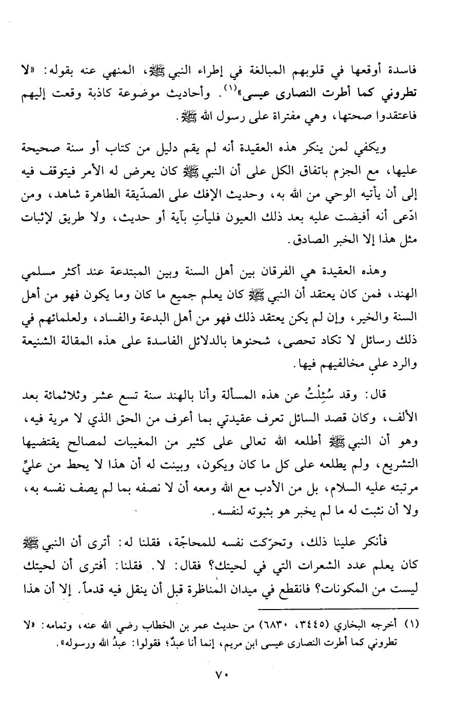 قال: وقد سُئِلْتُ عن هذه المسألة وأنا بالهند سنة تسع عشر وثلاثمائة بعد الألف، وكان قصد السائل تعرف عقيدتي بما أعرف من الحق الذي لا مرية فيه، وهو أن النبي صلى الله عليه وسلم أطلعه الله تعالى على كثير من المغيبات لمصالح يقتضيها التشريع، ولم يطلعه على كل ما كان ويكون، وبينت له أن هذا لا يحط من عليِّ مرتبته عليه السلام، بل من الأدب مع الله ومعه أن لا نصفه بما لم يصف نفسه به، ولا أن نثبت له ما لم يخبر هو بثبوته لنفسه.