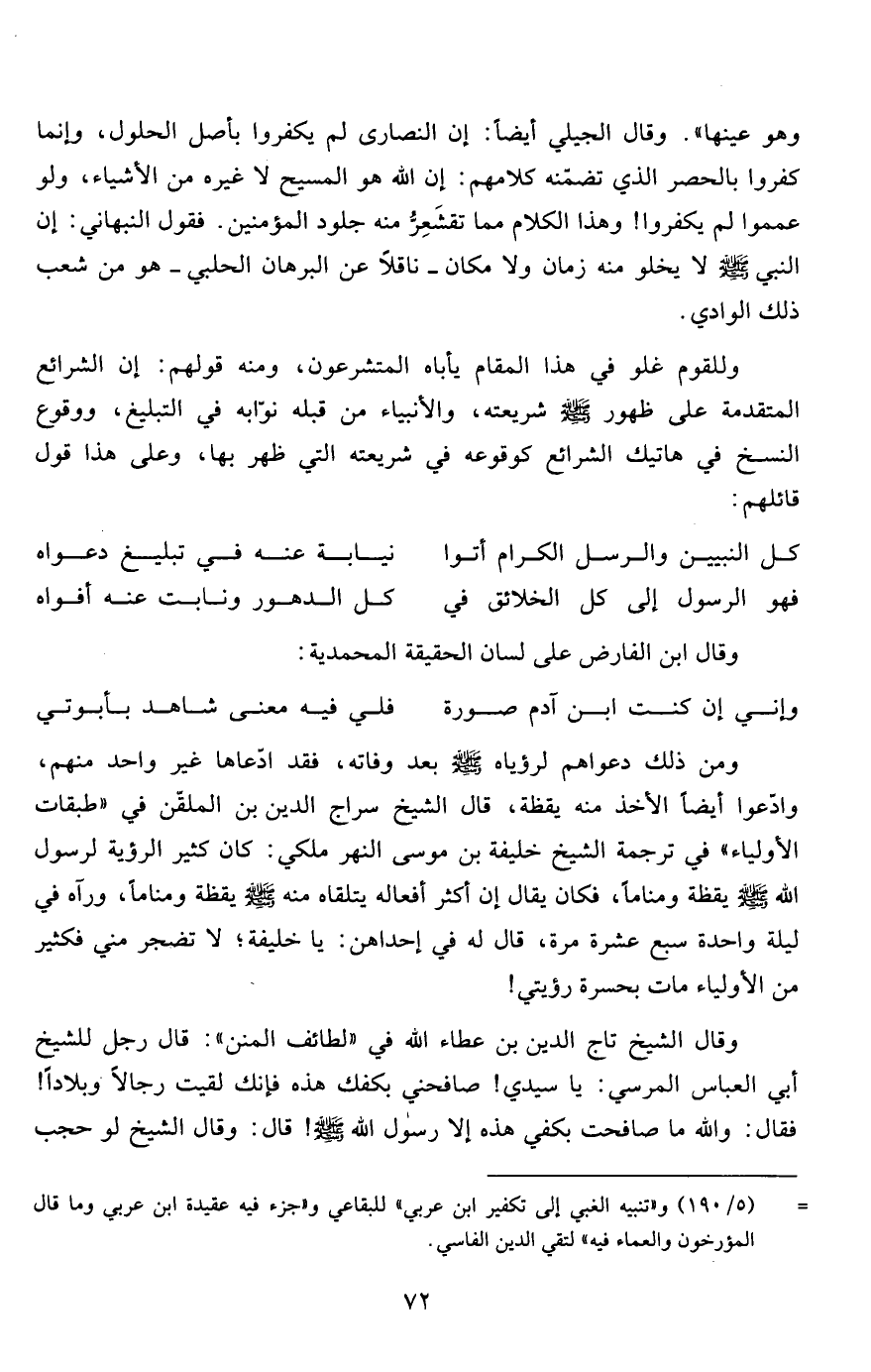 وهو عينها". وقال الجيلي أيضاً: إن النصارى لم يكفروا بأصل الحلول، وإنما كفروا بالحصر الذي تضمّنه كلامهم: إن الله هو المسيح لا غيره من الأشياء، ولو عمموا لم يكفروا! وهذا الكلام مما تقشَعِرُّ منه جلود المؤمنين. فقول النبهاني: إن النبي صلى الله عليه وسلم لا يخلو منه زمان ولا مكان- ناقلاً عن البرهان الحلبي- هو من شعب ذلك الوادي.