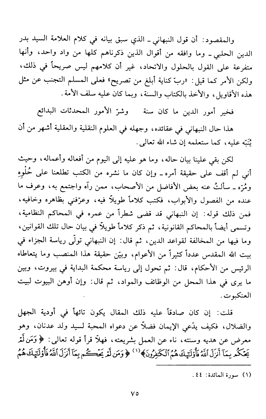 هذا حال النبهاني في عقائده، وجهله في العلوم النقلية والعقلية أشهر من أن يُنَبّه عليه، كما ستعلمه إن شاء الله تعالى.