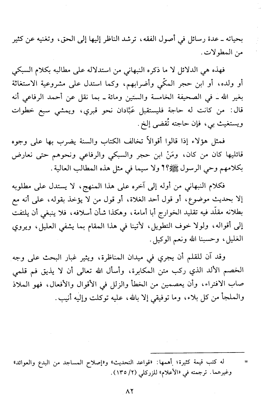 فكلام النبهاني من أوله إلى آخره على هذا المنهج، لا يستدل على مطلوبه إلا بحديث موضوع، أو قول أحد الغلاة، أو قول من لا يؤخذ بقوله، على أنه مع بطلانه مقلّد فيه تقليد الخوارج أبا أمامة، وهكذا شأن أسلافه، فلا ينبغي أن يلتفت إلى أقواله، ولولا خوف التطويل، لأتينا في هذا المقام بما يشفي العليل، ويروي الغليل، وحسبنا الله ونعم الوكيل.