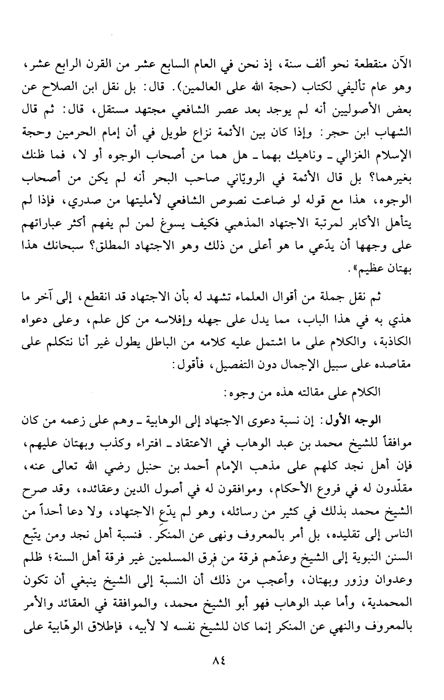 الوجه الأول: إن نسبة دعوى الاجتهاد إلى الوهابية -وهم على زعمه من كان موافقاً للشيخ محمد بن عبد الوهاب في الاعتقاد- افتراء وكذب وبهتان عليهم، فإن أهل نجد كلهم على مذهب الإمام أحمد بن حنبل رضي الله تعالى عنه، مقلّدون له في فروع الأحكام، وموافقون له في أصول الدين وعقائده، وقد صرح الشيخ محمد بذلك في كثير من رسائله، وهو لم يدّعِ الاجتهاد، ولا دعا أحداً من الناس إلى تقليده، بل أمر بالمعروف ونهى عن المنكر. فنسبة أهل نجد ومن يتّبع السنن النبوية إلى الشيخ وعدّهم فرقة من فرق المسلمين غير فرقة أهل السنة؛ ظلم وعدوان وزور وبهتان، وأعجب من ذلك أن النسبة إلى الشيخ ينبغي أن تكون المحمدية، وأما عبد الوهاب فهو أبو الشيخ محمد، والموافقة في العقائد والأمر بالمعروف والنهي عن المنكر إنما كان للشيخ نفسه لا لأبيه، فإطلاق الوهّابية على