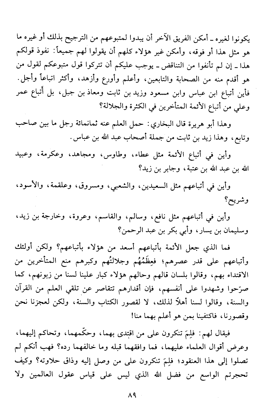 يكونوا لغيره -أمكن الفريق الآخر أن يبدوا لمتبوعهم من الترجيح بذلك أو غيره ما هو مثل هذا أو فوقه، وأمكن غير هؤلاء كلهم أن يقولوا لهم جميعاً: نفوذ قولكم هذا- إن لم تأنفوا من التناقض- يوجب عليكم أن تتركوا قول متبوعكم لقول من هو أقدم منه من الصحابة والتابعين، وأعلم وأورع وأزهد، وأكثر اتباعاً وأجل. فأين أتباع ابن عباس وابن مسعود وزيد بن ثابت ومعاذ بن جبل، بل أتباع عمر وعلي من أتباع الأئمة المتأخرين في الكثرة والجلالة؟