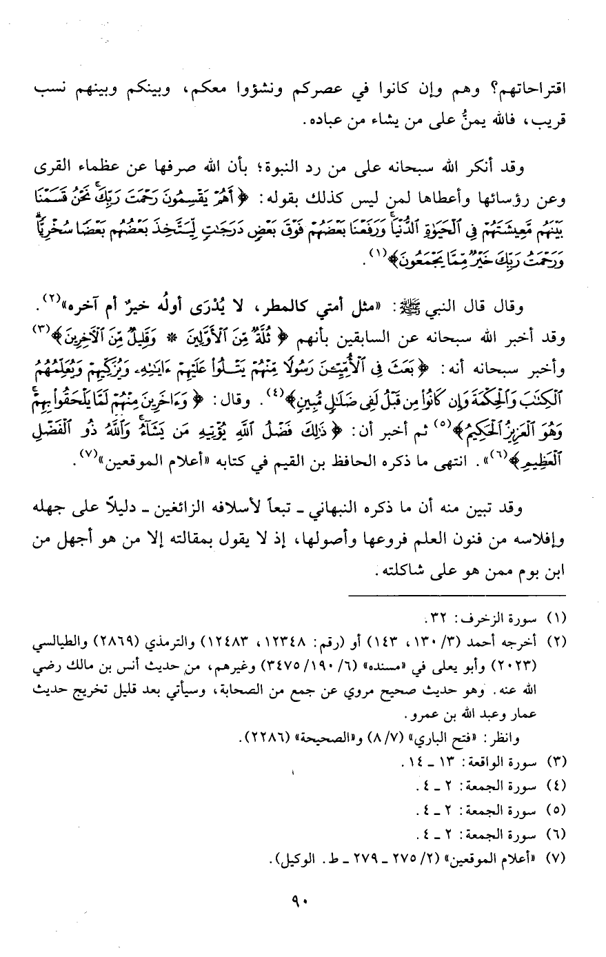 وقد تبين منه أن ما ذكره النبهاني- تبعاً لأسلافه الزائغين- دليلاً على جهله وإفلاسه من فنون العلم فروعها وأصولها، إذ لا يقول بمقالته إلا من هو أجهل من ابن بوم ممن هو على شاكلته.