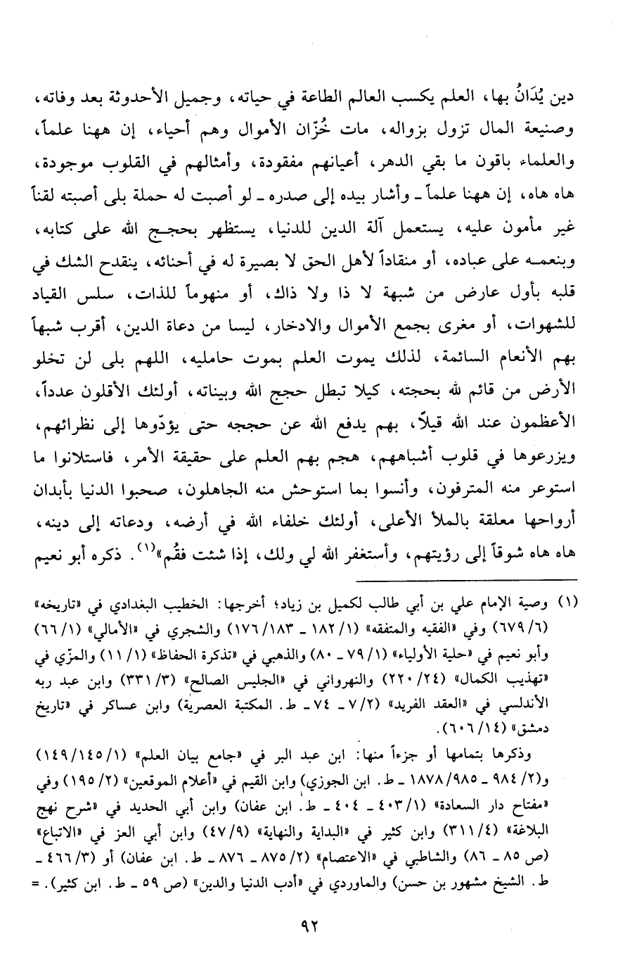 1 وصية الإمام علي بن أبي طالب لكميل بن زياد؛ أخرجها: الخطيب البغدادي في "تاريخه" (6/679) وفي "الفقيه والمتفقه" (1/182-183/176) والشجري في "الأمالي" (1/66) وأبو نعيم في "حلية الأولياء" (1/79- 80) والذهبي في "تذكرة الحفاظ" (1/11) والمزّي في "تهذيب الكمال" (24/ 220) والنهرواني في "الجليس الصالح" (3/331) وابن عبد ربه الأندلسي في "العقد الفريد" (2/7- 74- ط. المكتبة العصرية) وابن عساكر في "تاريخ دمشق" (14/606) .