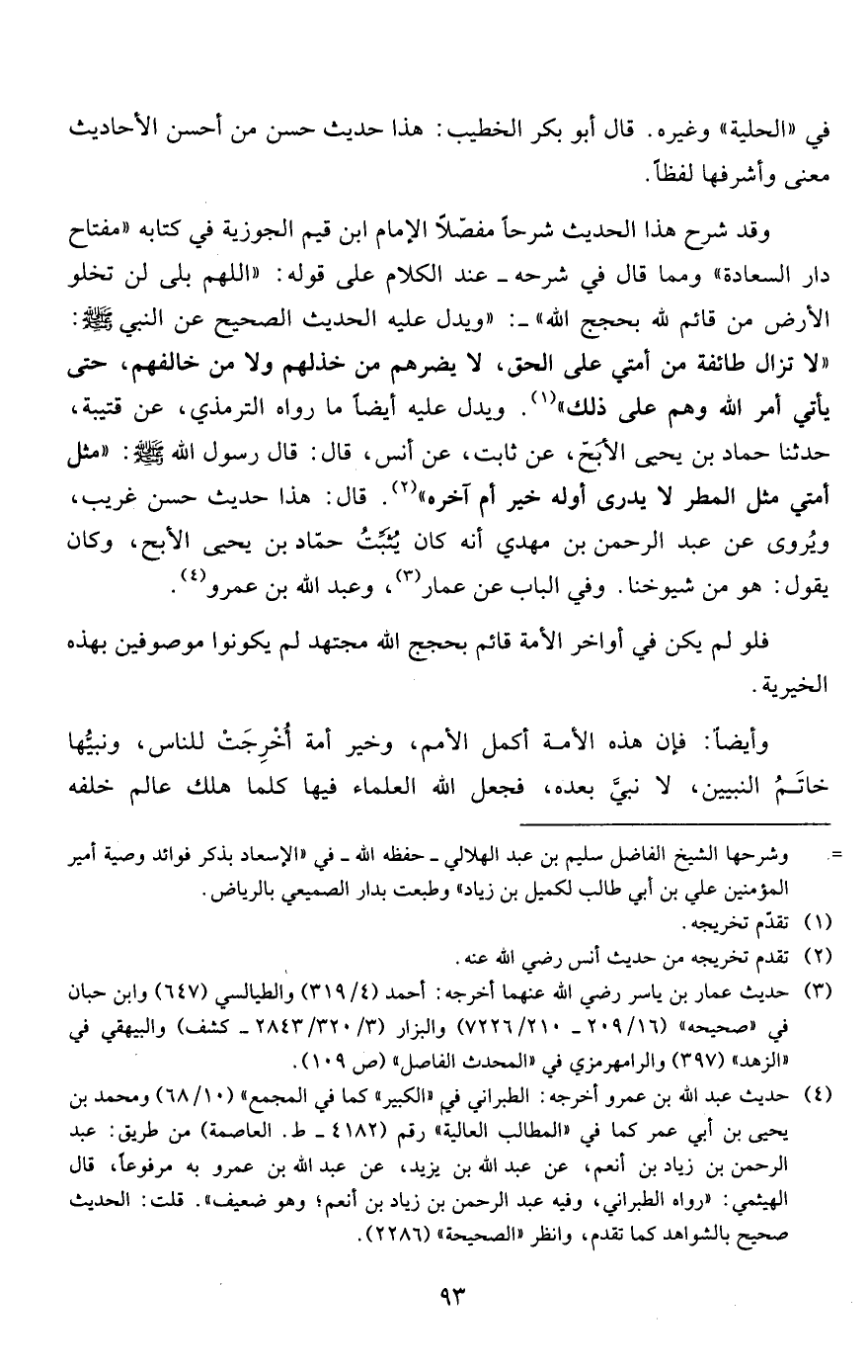 وقد شرح هذا الحديث شرحاً مفصّلاً الإمام ابن قيم الجوزية في كتابه "مفتاح دار السعادة" ومما قال في شرحه -عند الكلام على قوله: "اللهم بلى لن تخلو الأرض من قائم لله بحجج الله"-:"ويدل عليه الحديث الصحيح عن النبي صلى الله عليه وسلم: "لا تزال طائفة من أمتي على الحق، لا يضرهم من خذلهم ولا من خالفهم، حتى يأتي أمر الله وهم على ذلك" 1. ويدل عليه أيضاً ما رواه الترمذي، عن قتيبة، حدثنا حماد بن يحيى الأبَحّ، عن ثابت، عن أنس، قال: قال رسول الله صلى الله عليه وسلم: "مثل أمتي مثل المطر لا يدرى أوله خير أم آخره"2. قال: هذا حديث حسن غريب، ويُروى عن عبد الرحمن بن مهدي أنه كان يُثَبِّتُ حمّاد بن يحيى الأبح، وكان يقول: هو من شيوخنا. وفي الباب عن عمار3، وعبد الله بن عمرو4.