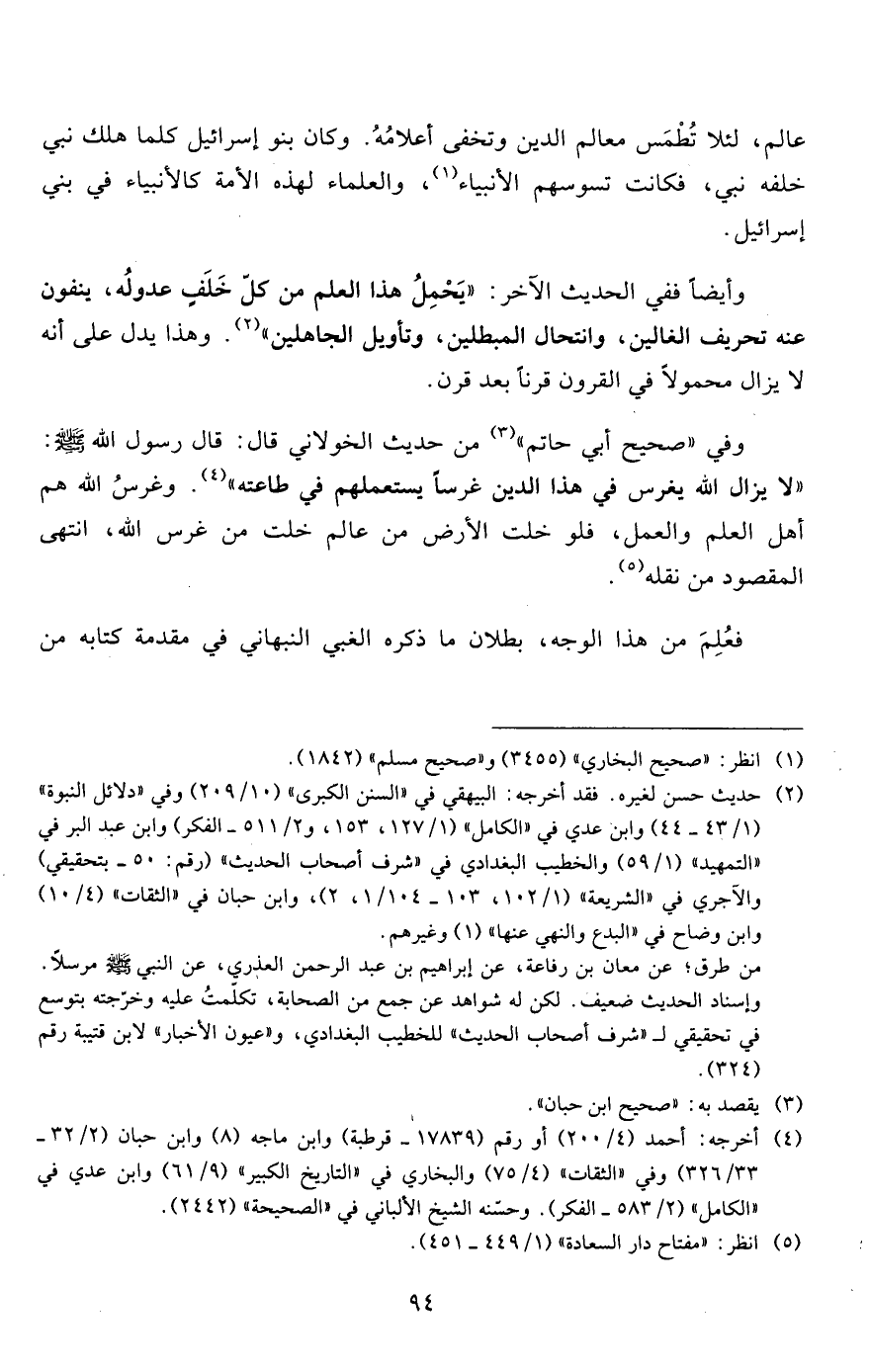 وأيضاً ففي الحديث الآخر:" يَحْمِلُ هذا العلم من كلّ خَلَفٍ عدولُه، ينفون عنه تحريف الغالين، وانتحال المبطلين، وتأويل الجاهلين"2. وهذا يدل على أنه لا يزال محمولاً في القرون قرناً بعد قرن.