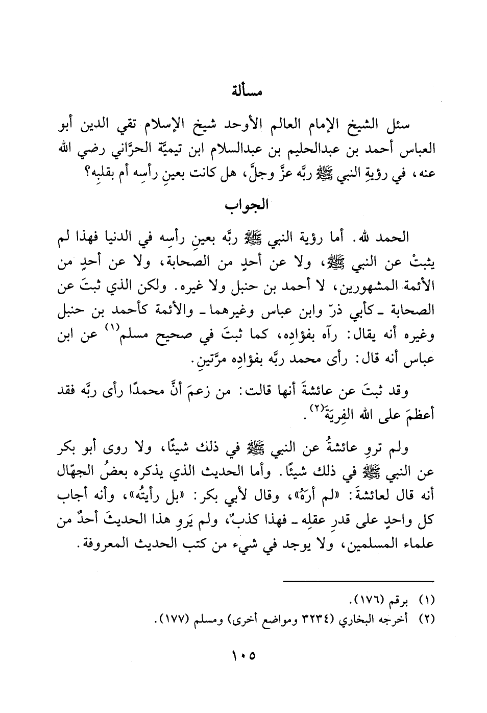 سئل الشيخ الإمام العالم الأوحد شيخ الإسلام تقي الدين أبو العباس أحمد بن عبد الحليم بن عبد السلام ابن تيمية الحرَّاني رضي الله عنه، في رؤيةِ النبي - صَلَّى اللَّهُ عَلَيْهِ وَسَلَّمَ - ربَّه عز وجلَّ، هل كانت بعينِ رأسِه أم بقلبِه؟