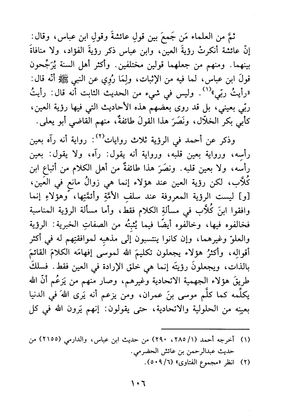 وذكر عن أحمد في الرؤية ثلاث روايات (2): رواية أنه رآه بعين رأسِه، ورواية بعين قلبه، ورواية أنه يقول: رآه، ولا يقول: بعين رأسه، ولا بعين قلبه. ونصَرَ هذا طائفةٌ من أهل الكلام من أتباع ابن كُلاَّب، لكن رؤية العين عند هؤلاء إنما هي زوالُ مانع في العَين، [و] ليست الرؤية المعروفة عند سلفِ الأمَّةِ وأئمَّتِها، وهؤلاءِ إنما وافقوا ابنَ كُلاَّب في مسألة الكلام فقط، وأما مسألة الرؤية المناسبة فخالفوه فيها، وخالفوه أيضًا فيما يُثبتُه من الصفاتِ الخبرية: الرؤية والعلوّ وغيرهما، وإن كانوا ينتسبون إَلى مذهبه لموافقتِهم له في أكثر أقوالِه، وأكثرُ هؤلاء يجعلون تكليمَ الله لموسَى إفهامَه الكلامَ القائمَ بالذات، ويجعلونَ رؤيتَه إنما هي خلق الإرادة في العين فقط. فسلكَ طريقَ هؤلاء الجهمية الاتحادية وغيرهم، وصار منهم من يَزعُم أنّ الله يكلِّمه كما كلَّم موسى بنَ عمران، ومن يزعم أنه يَرى الله في الدنيا بعينه من الحلولية والاتحادية، حتى يقولون: إنهم يَرون الله في كل