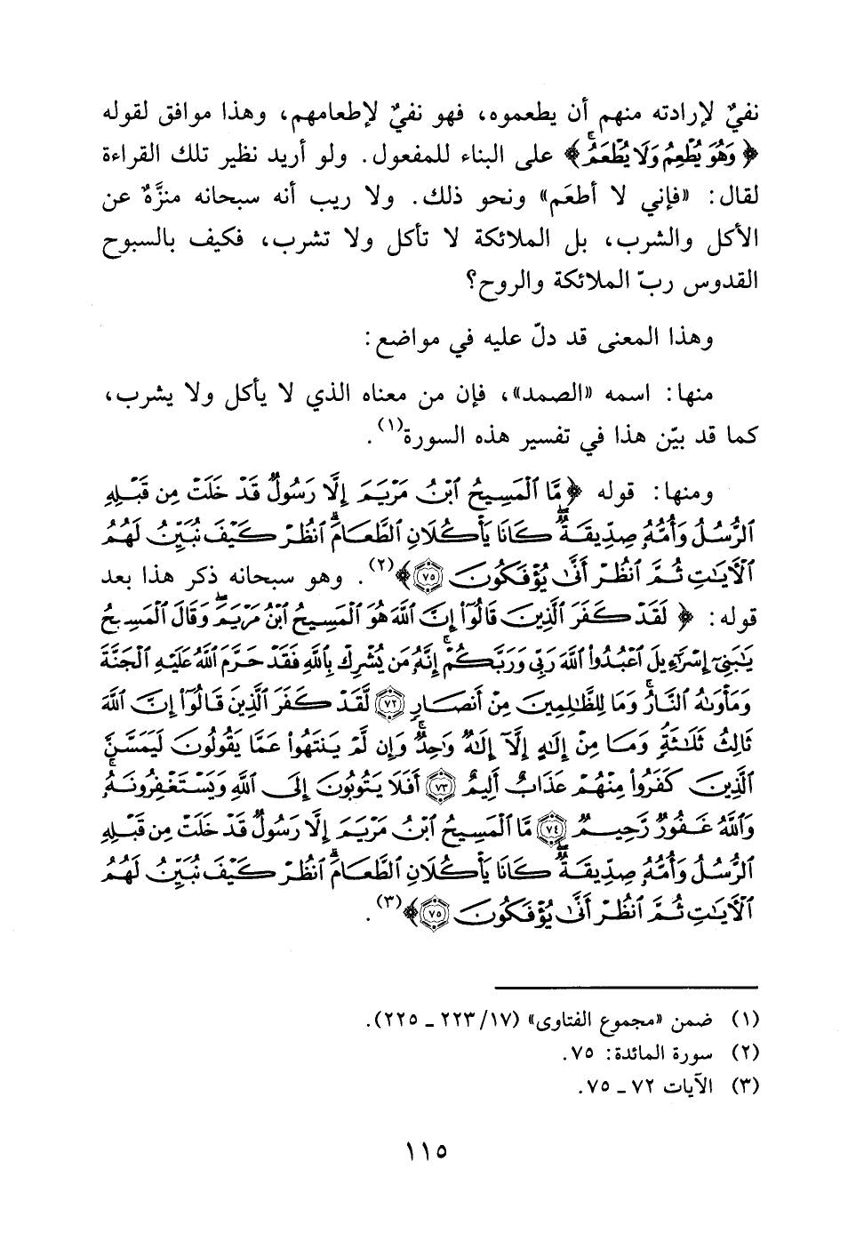ومنها: قوله (ما المسيح ابن مريم إلا رسول قد خلت من قبله الرسل وأمه صديقه كانا يأكلان الطعام انظر كيف نبين لهم الآيات ثم انظر أنى يؤفكون (75)) (2). وهو سبحانه ذكر هذا بعد قوله: (لَقَدْ كَفَرَ الَّذِينَ قَالُوا إِنَّ اللَّهَ هُوَ الْمَسِيحُ ابْنُ مَرْيَمَ وَقَالَ الْمَسِيحُ يَا بَنِي إِسْرَائِيلَ اعْبُدُوا اللَّهَ رَبِّي وَرَبَّكُمْ إِنَّهُ مَنْ يُشْرِكْ بِاللَّهِ فَقَدْ حَرَّمَ اللَّهُ عَلَيْهِ الْجَنَّةَ وَمَأْوَاهُ النَّارُ وَمَا لِلظَّالِمِينَ مِنْ أَنْصَارٍ (72) لَقَدْ كَفَرَ الَّذِينَ قَالُوا إِنَّ اللَّهَ ثَالِثُ ثَلَاثَةٍ وَمَا مِنْ إِلَهٍ إِلَّا إِلَهٌ وَاحِدٌ وَإِنْ لَمْ يَنْتَهُوا عَمَّا يَقُولُونَ لَيَمَسَّنَّ الَّذِينَ كَفَرُوا مِنْهُمْ عَذَابٌ أَلِيمٌ (73) أَفَلَا يَتُوبُونَ إِلَى اللَّهِ وَيَسْتَغْفِرُونَهُ وَاللَّهُ غَفُورٌ رَحِيمٌ (74) مَا الْمَسِيحُ ابْنُ مَرْيَمَ إِلَّا رَسُولٌ قَدْ خَلَتْ مِنْ قَبْلِهِ الرُّسُلُ وَأُمُّهُ صِدِّيقَةٌ كَانَا يَأْكُلَانِ الطَّعَامَ انْظُرْ كَيْفَ نُبَيِّنُ لَهُمُ الْآَيَاتِ ثُمَّ انْظُرْ أَنَّى يُؤْفَكُونَ (75)) (3).