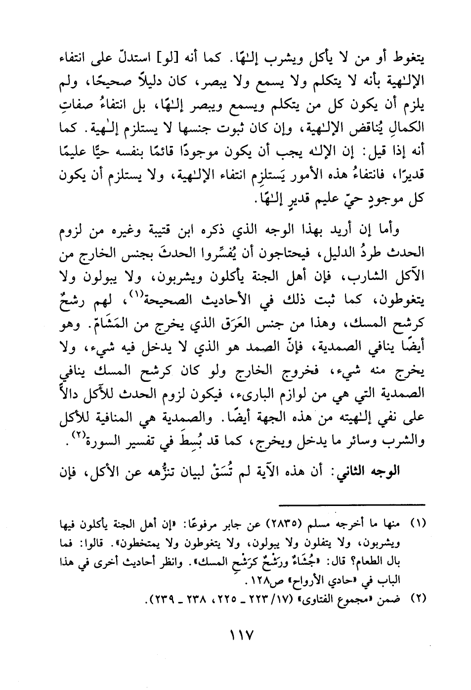 وأما إن أريد بهذا الوجه الذي ذكره ابن قتيبة وغيره من لزوم الحدث طردُ الدليل، فيحتاجون أن يُفسِّروا الحدثَ بجنس الخارج من الآكل الشارب، فإن أهل الجنة يأكلون ويشربون، ولا يبولون ولا يتغوطون، كما ثبت ذلك في الأحاديث الصحيحة (1)، لهم رشح كرشح المسك، وهذا من جنس العَرَق الذي يخرج من المَشَام. وهو أيضًا ينافي الصمدية، فإنّ الصمد هو الذي لا يدخل فيه شيء، ولا يخرج منه شيء، فخروج الخارج ولو كان كرشح المسك ينافي الصمدية التي هي من لوازم البارئ، فيكون لزوم الحدث للأكل دالاًّ على نفي إلهيته منْ هذه الجهة أيضًا. والصمدية هي المنافية للأكل والشرب وسائر ما يدخل ويخرج، كما قد بُسِطَ في تفسير السورة (2).
