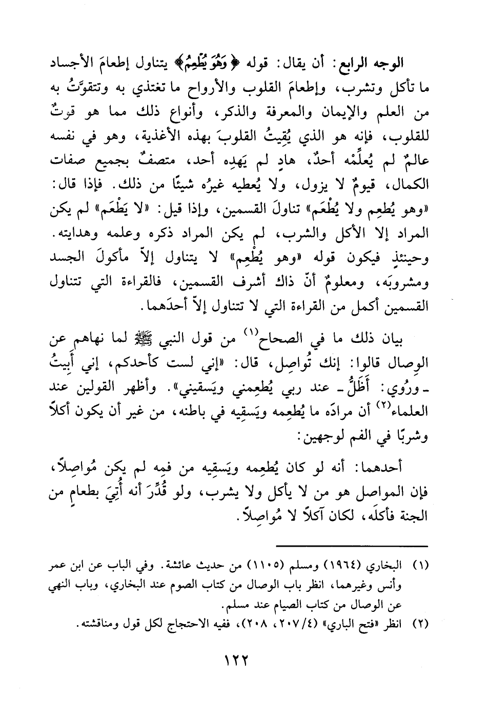 وحينئذٍ فيكون قوله "وهو يُطْعِم" لا يتناول إلاّ مأكولَ الجسد ومشروبَه، ومعلومٌ أنّ ذاك أشرف القسمين، فالقراءة التي تتناول القسمين أكمل من القراءة التي لا تتناول إلاّ أحدَهما.