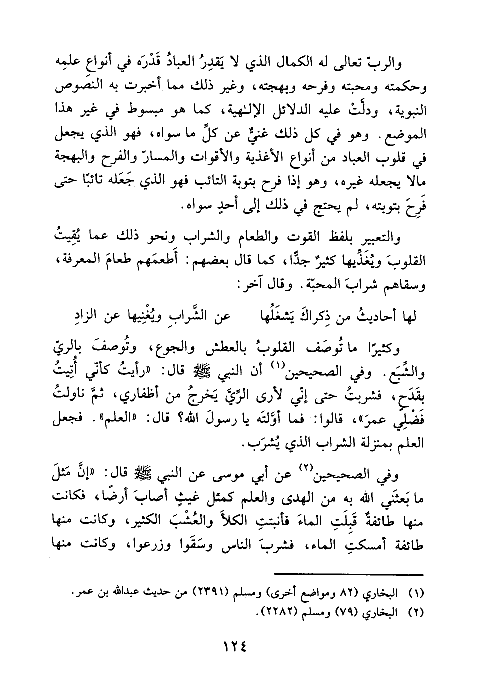 وكثيرًا ما تُوصَف القلوبُ بالعطش والجوع، وتُوصفَ بالريّ والشّبَع. وفي الصحيحين (1) أن النبي - صَلَّى اللَّهُ عَلَيْهِ وَسَلَّمَ - قال: "رأيتُ كأنّي أُتِيتُ بقَدَحٍ، فشربتُ حتى إني لأرى الرِّيَّ يَخرجُ من أظفاري، ثمَّ ناولتُ فَضْلِي عمرَ"، قالوا: فما أوَّلتَه يا رسولَ الله؟ قال: "العلم". فجعل العلم بمنزلة الشراب الذي يُشرَب.