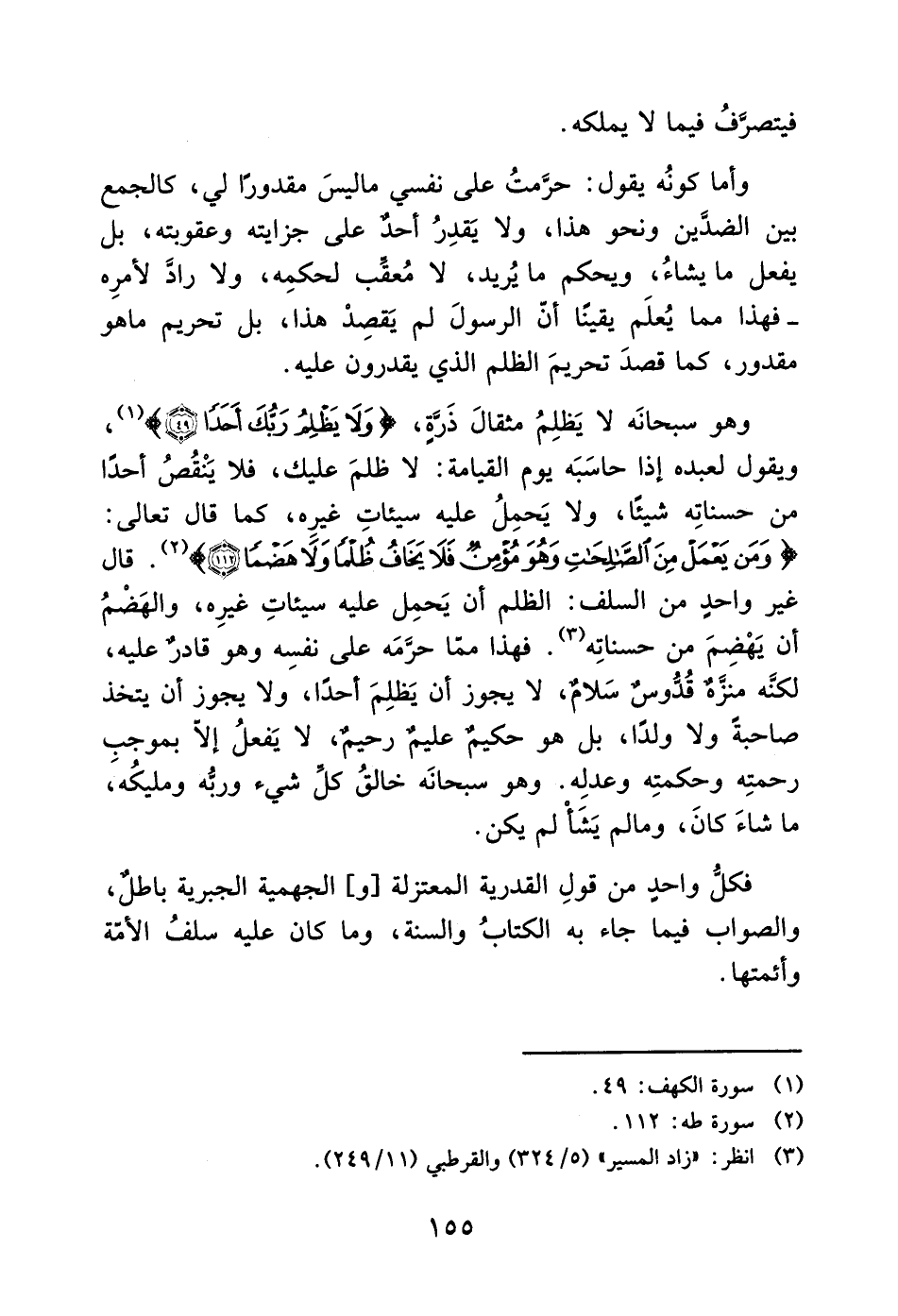 وهو سبحانَه لا يَظلِمُ مثقالَ ذَرةٍ، (ولا يظلم ربك أحداً (49)) (1)، ويقول لعبده إذا حاسَبَه يوم القيامة: لا ظلمَ عليك، فلا يَنْقُصُ أحدًا من حسناتِه شيئًا، ولا يَحمِلُ عليه سيئاتِ غيرِه، كما قال تعالى: (وَمَنْ يَعْمَلْ مِنَ الصَّالِحَاتِ وَهُوَ مُؤْمِنٌ فَلا يَخَافُ ظُلْماً وَلا هَضْماً (112)) (2). قال غير واحدٍ من السلف: الظلم أن يَحمِل عليه سيئاتِ غيرِه، والهَضْمُ أن يَهْضِمَ من حسناتِه (3). فهذا مما حرَّمَه على نفسِه وهو قادرٌ عليه، لكنه منزهٌ قُدُّوسٌ سَلامٌ، لا يجوز أن يَظلِمَ أحدًا، ولا يجوز أن يتخذ صاحبةً ولا ولدًا، بل هو حكيم عليمٌ رحيمٌ، لا يَفعلُ إلاّ بموجب رحمتِه وحكمتِه وعدلِه. وهو سبحانَه خالقُ كلَّ شيء وربُّه ومليكُه، ما شاءَ كانَ، ومالم يَشَأ لم يكن.